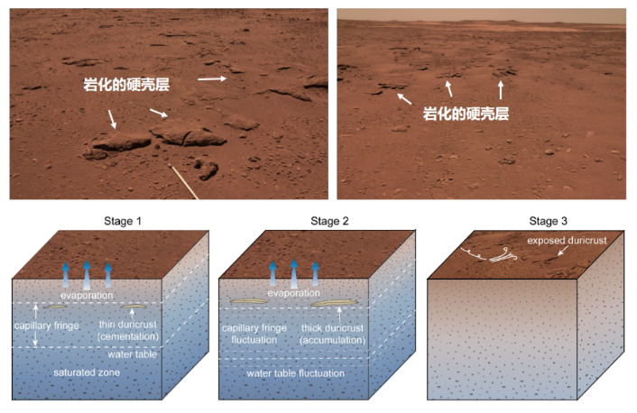 中国科学院国家空间科学中心空间天气学国家重点实验室刘洋研究团队推断认为,这可能是由地下水涌溢或者毛细作用蒸发结晶出的盐类矿物,胶结火星土壤后经岩化作用形成,揭示了着陆区近期有水活动迹象。
