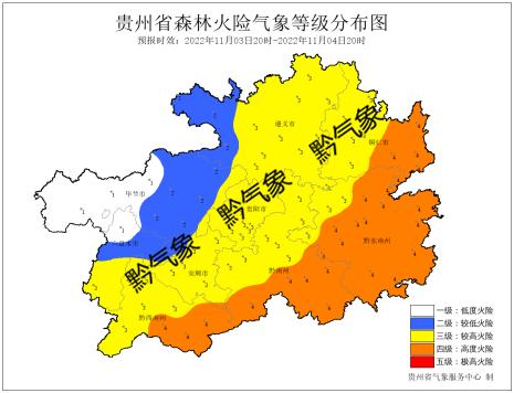 2022年11月03日20时-11月04日20时:省的西北部地区森林火险气象等级为1-2级,危险程度低或较低,其余大部地区森林火险气象等级为3-4级,危险程度较高或高。