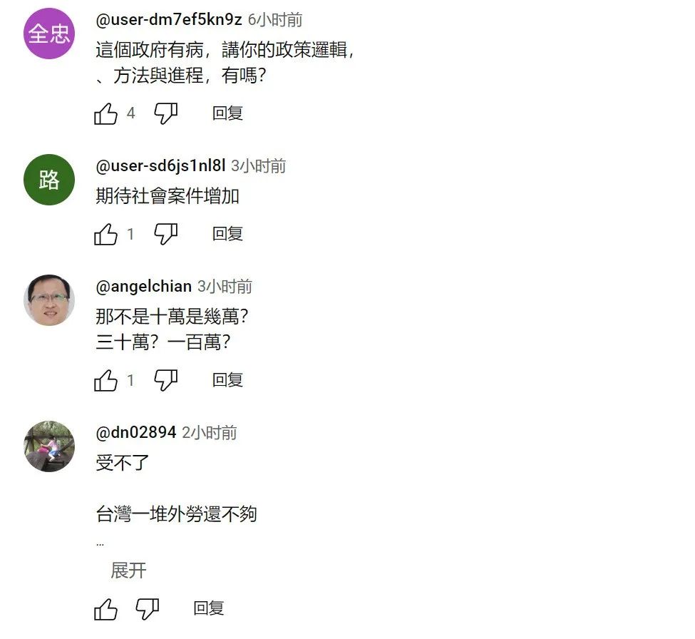 而在多家台媒相关新闻的评论区,绝大多数岛内网民也对这一做法表示反对,不少人对引进劳工后潜在的社会治安问题感到担忧。而对于民进党称“引进人数没有网传的10万人之多”,许多网民嗤之以鼻,认为当局没有回应民众对其搞暗箱操作的质疑,试图避重就轻。