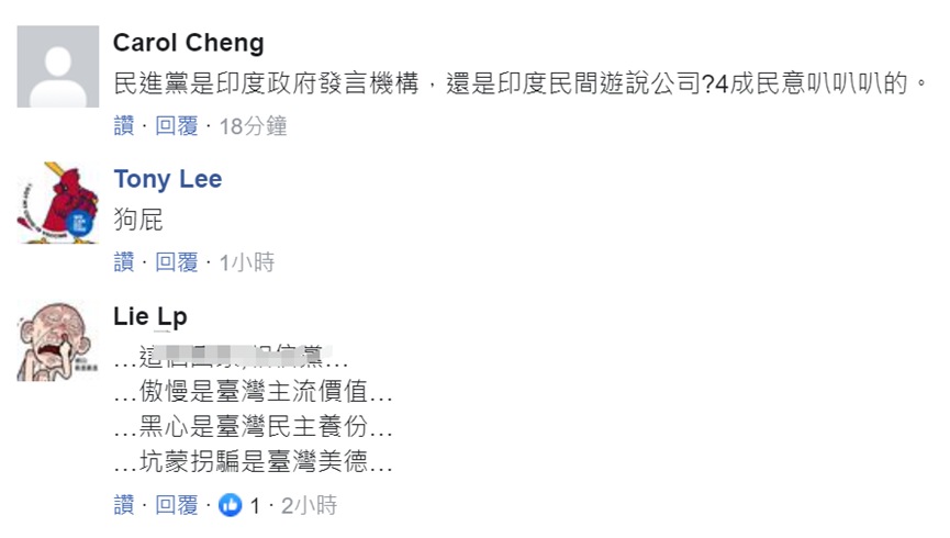 林子伦的发言很快遭到了网民的吐槽,有人称民进党当局像是“印度政府发言机构”“印度民间游说公司”,还有人直斥其发言“傲慢、黑心、坑蒙拐骗”。