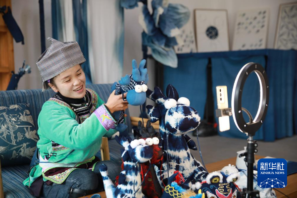 榕江县月亮故乡网络科技有限公司文创板块负责人罗芸告诉记者,原来蓝染产业是一个小众赛道,并不为大众熟知。在“村超”出圈之前,当地也曾尝试过线上直播来宣传榕江的非遗蓝染,但收效甚微。
