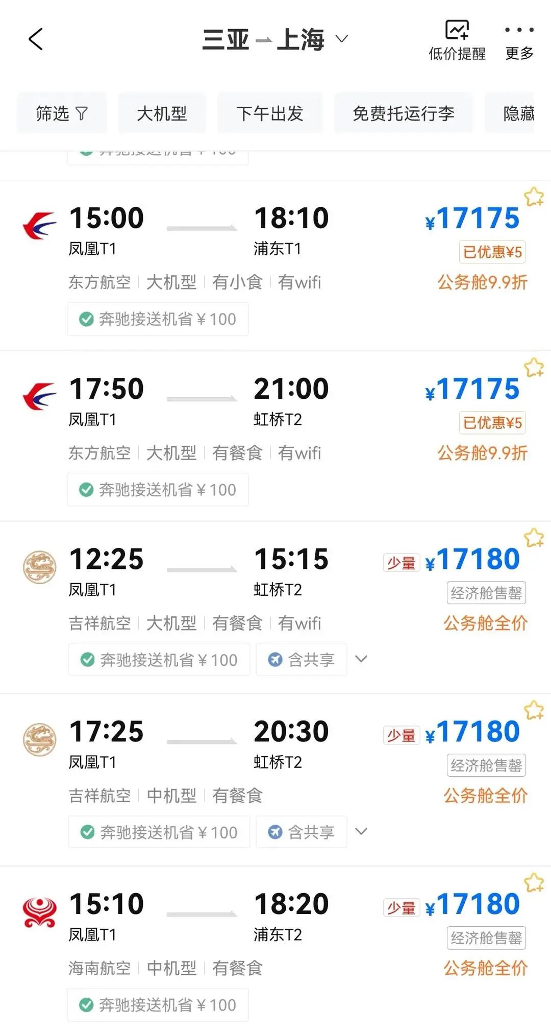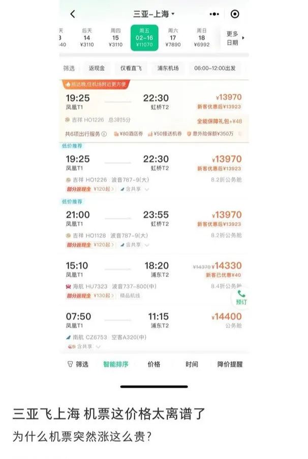 2月13日上午,记者在相关平台搜索注意到,目前三亚回程机票价格确实在暴涨。以三亚飞上海为例,2月14日-15日,只剩少量的全价经济舱机票,价格在3500元左右。公务舱的价格从8000元至17000元不等。2月16日-17日,经济舱的机票几乎全部售罄,公务舱的价格均在14000元以上。