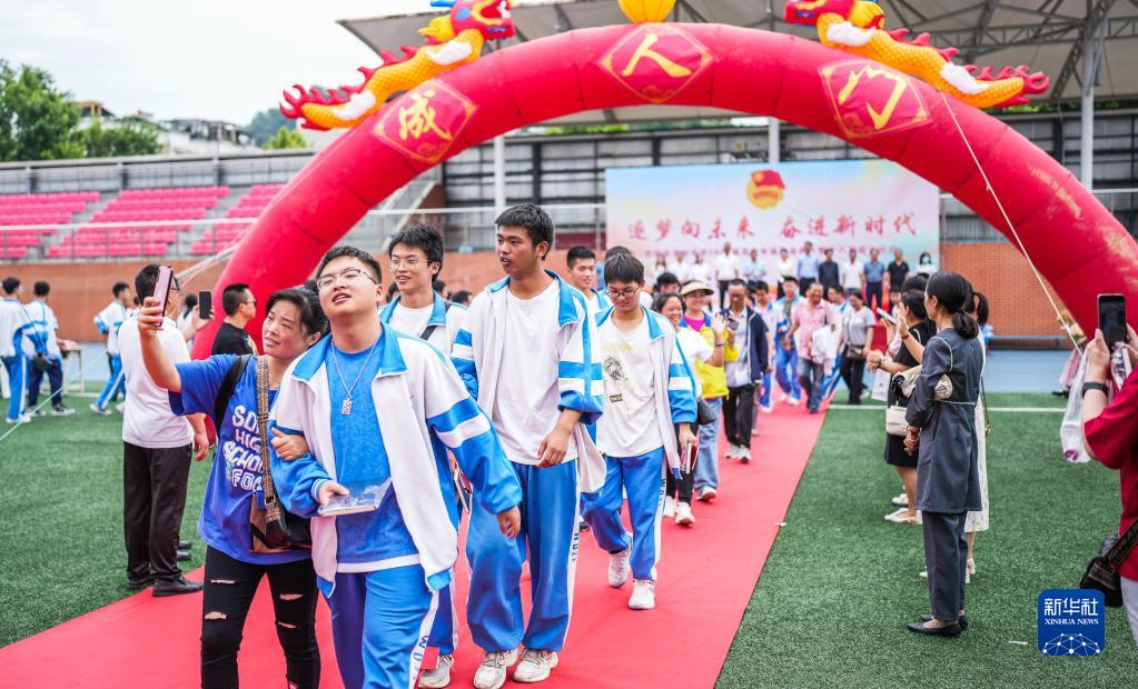 6月9日,乌当中学高三学生在毕业典礼上走过成人门。新华社记者 陶亮 摄
