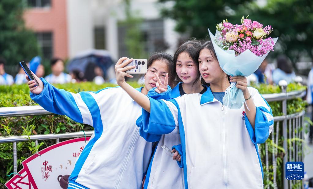 6月9日,乌当中学高三学生在校园广场自拍留念。新华社记者 陶亮 摄