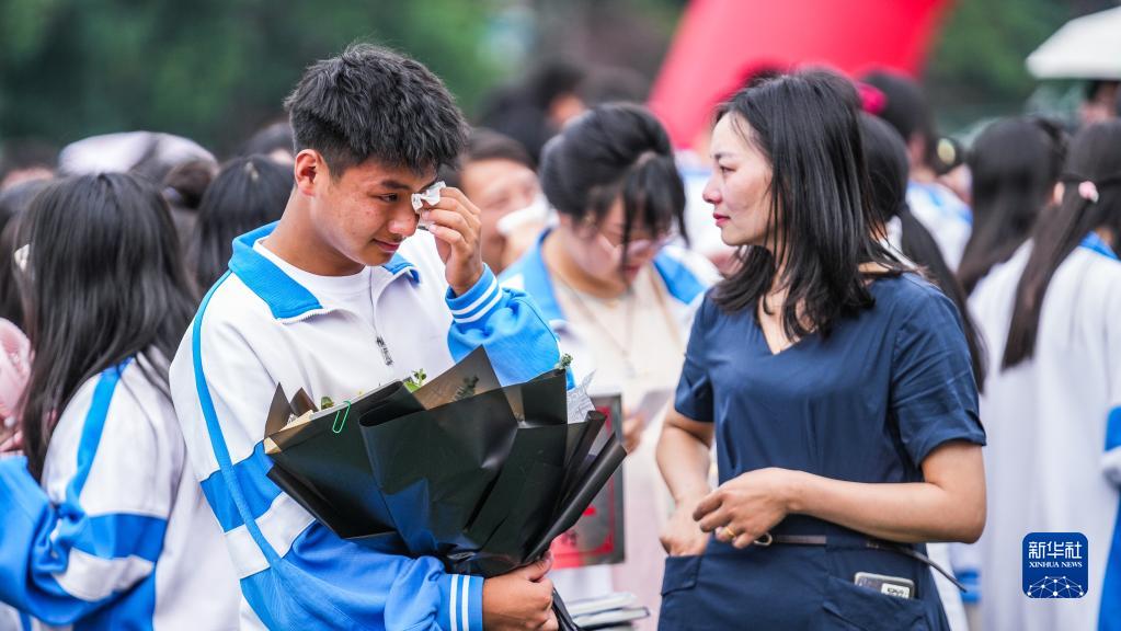 6月9日,乌当中学高三学生在毕业典礼上给老师献花。新华社记者 陶亮 摄