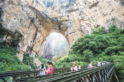 位于贵州省毕节市织金县的织金大峡谷景区云山雾绕,美轮美奂,胜似仙境,吸引不少游客前往避暑游玩。织金大峡谷景区内有保护完好的峡谷、天窗、天坑、天生桥、暗河、绝壁等地质遗迹。图为游客在织金大峡谷景区游玩。