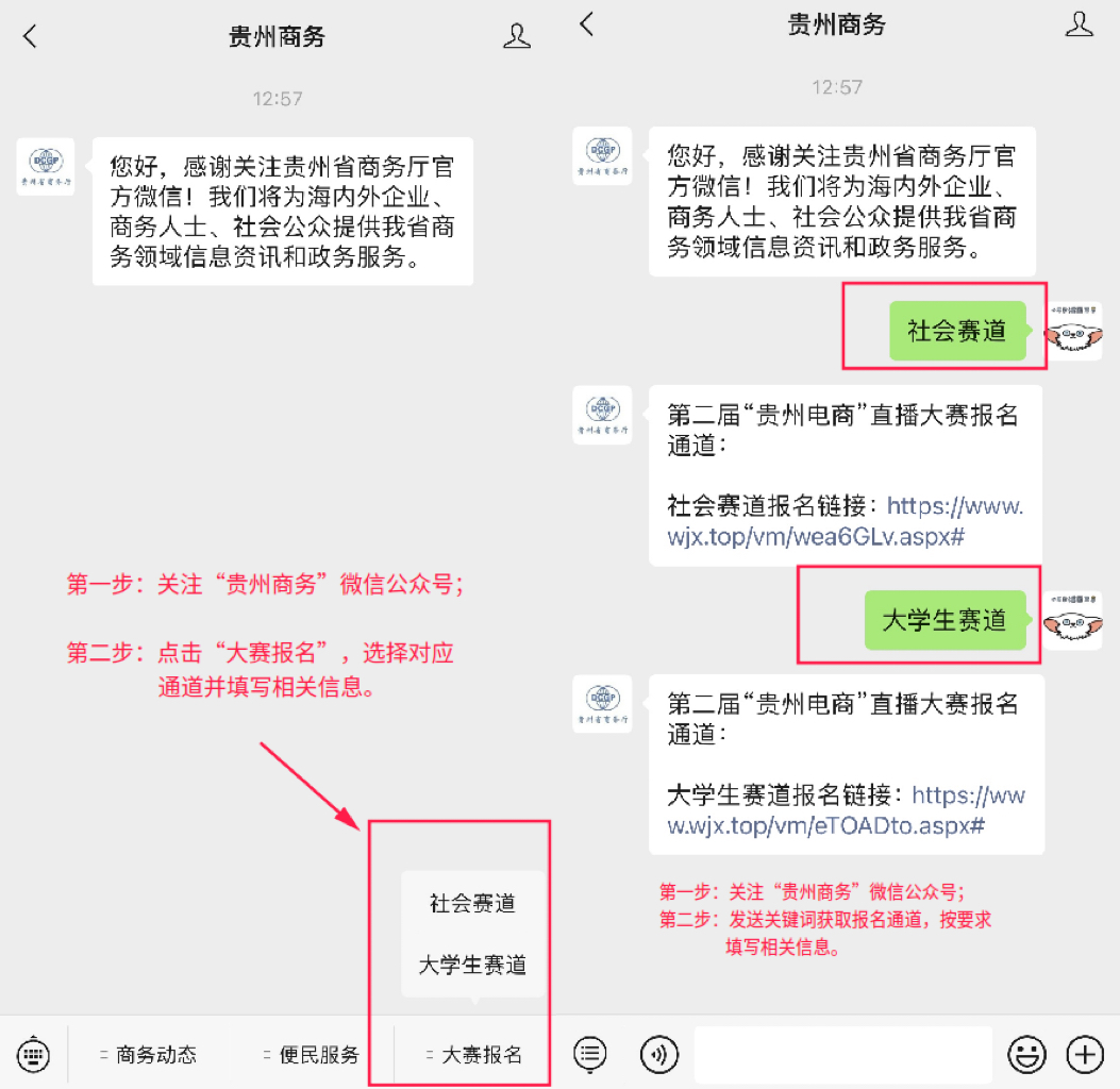 为构建“新消费”应用场景,培育壮大贵州直播电商队伍,打造贵州直播和贵州主播高品质名片,把贵州直播大赛塑造为主播show优质品牌,带动全网消费贵州产品,助推乡村振兴和经济繁荣。省商务厅联合团省委、省教育厅、省农业农村厅于2023年5月至12月举办第二届“贵州电商”直播大赛,本次大赛报名截止日期为2023年6月25日,各企业可组织自有或外聘团队参赛,每支参赛团队限1至5人报名。参赛人员可通过关注大赛官方微信公众号(贵州商务、贵州省电子商务产业发展协会),选择“社会赛道”或“大学生赛道”栏目进行报名,也可发送“社会赛道”或“大学生赛道”关键字获取报名表,按照要求填写报名信息。