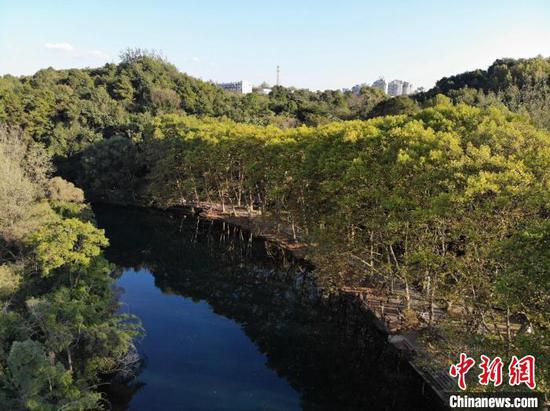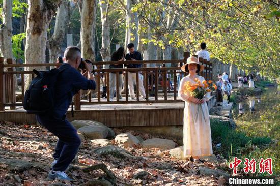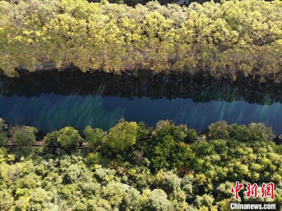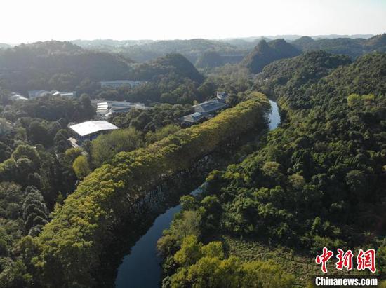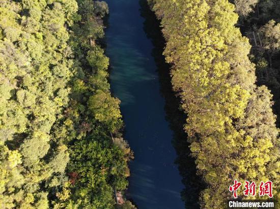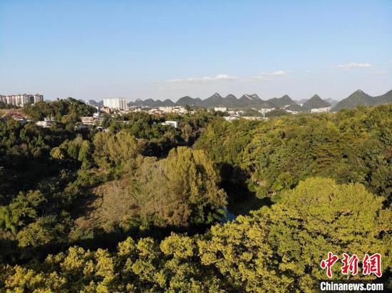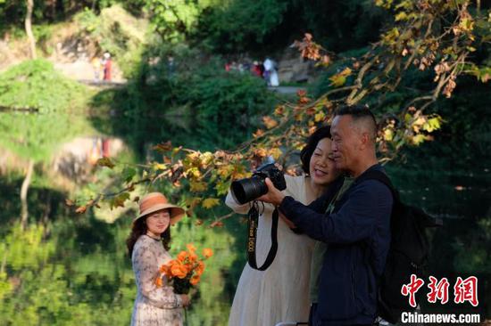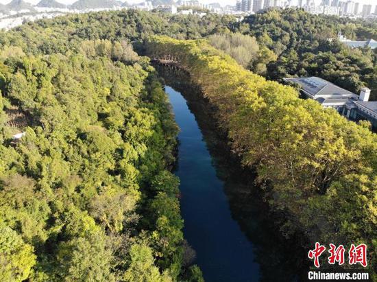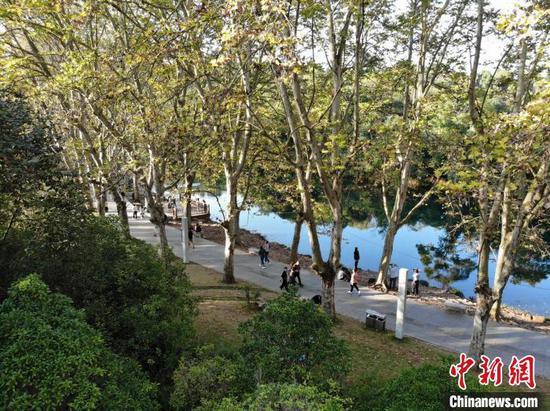 10月16日,贵州省贵阳市花溪区花溪河畔的“黄金大道”秋叶渐黄,吸引市民和游客在此游玩、拍照。“黄金大道”是一条沿着花溪河的梧桐步道,入秋后这里成片的梧桐树叶相继泛黄,与碧绿的花溪河形成一幅美丽画卷,秋色美不胜收。