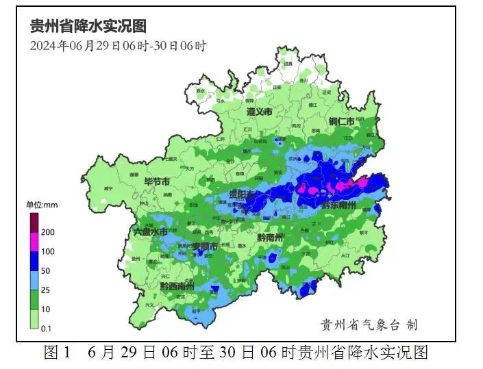 6月29日06时至30日06时,大暴雨出现在黔东南州的三穗、台江、天柱、施秉、镇远、黄平,黔南州的平塘、福泉、荔波9县(市)域内的43个观测站,大雨以上降雨主要分布在贵阳市中南部、遵义市东南部边缘、铜仁市南部边缘、黔东南州北部、黔南州北部和南部局地、六盘水市东北部、安顺市中西部、黔西南州东南部(图1)。