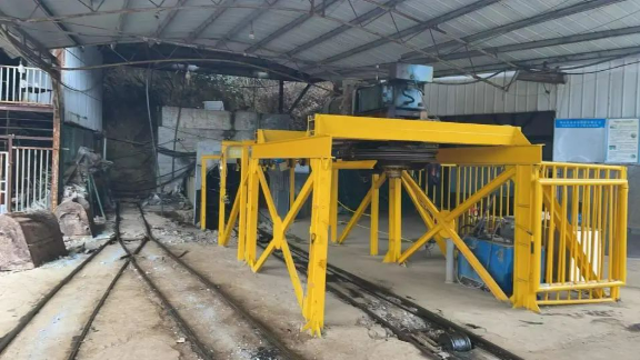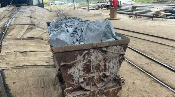 记者来到了湖南黄金天岳矿业有限公司团家洞金矿副井,目前该地已经暂时停工,现场留下一些设备,井口有一条不长的轨道,用来运输井下采集而来的岩石,地上停着的一台推车内还堆放了满满一小车的灰色岩石。