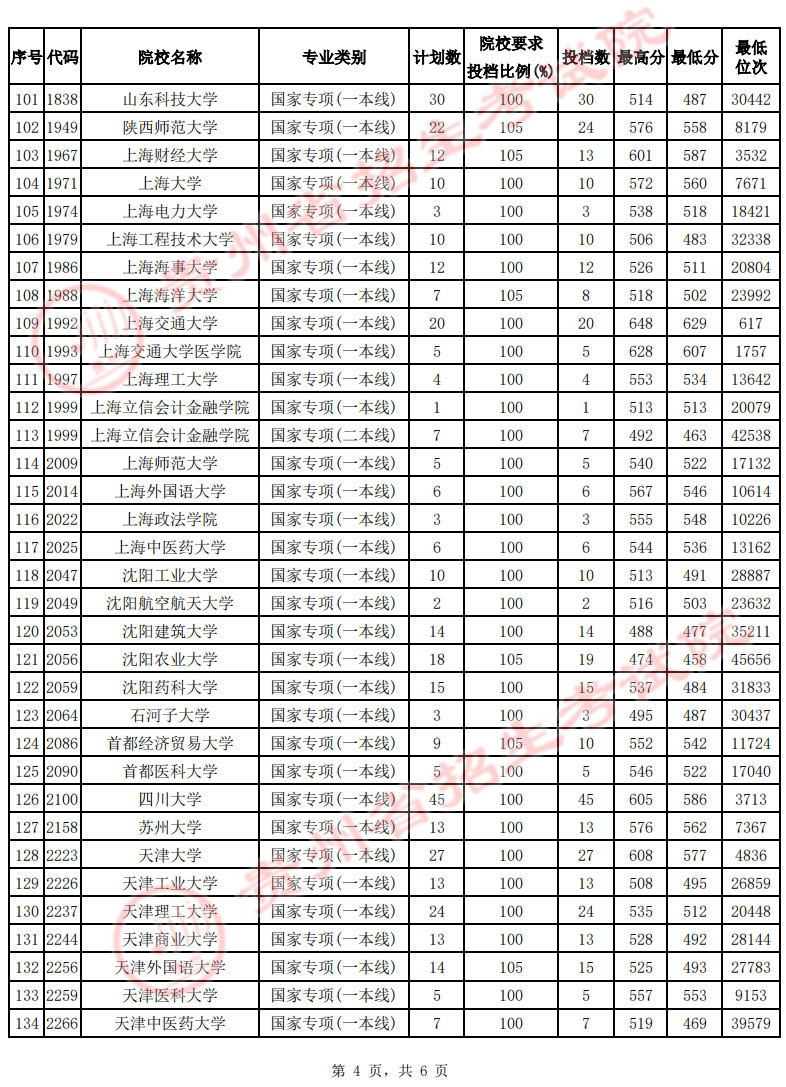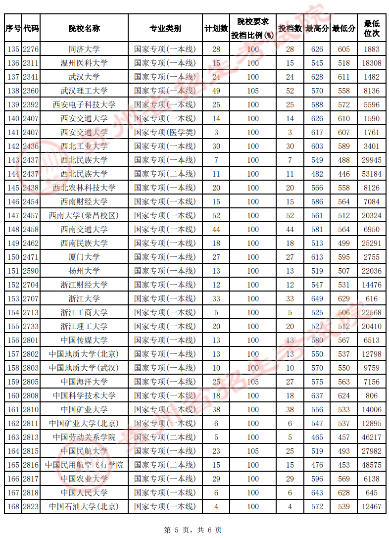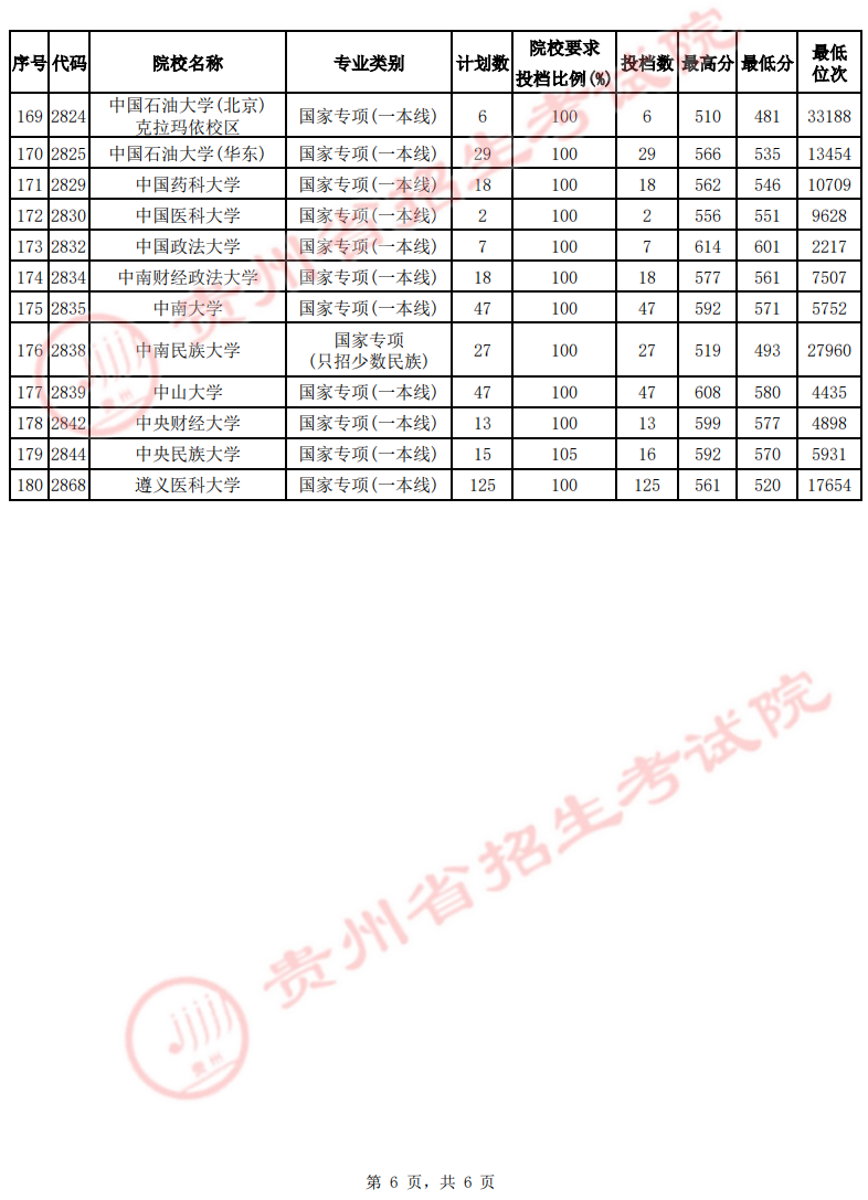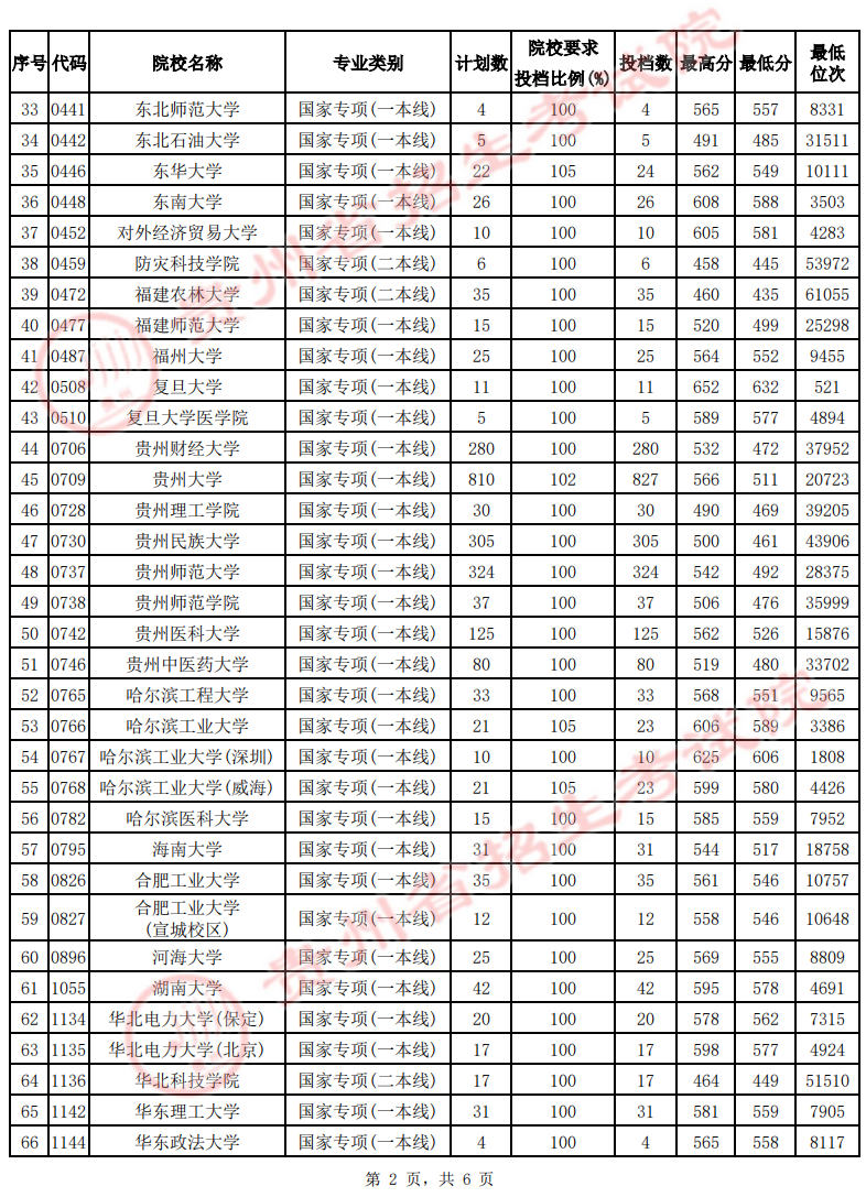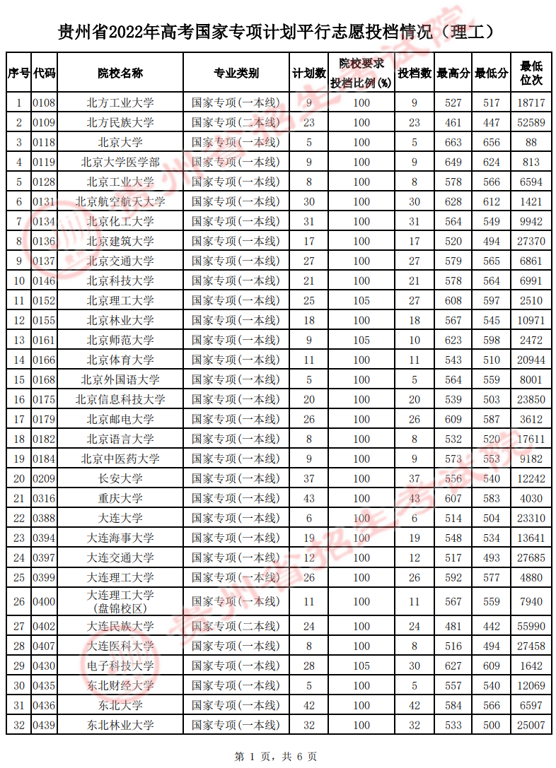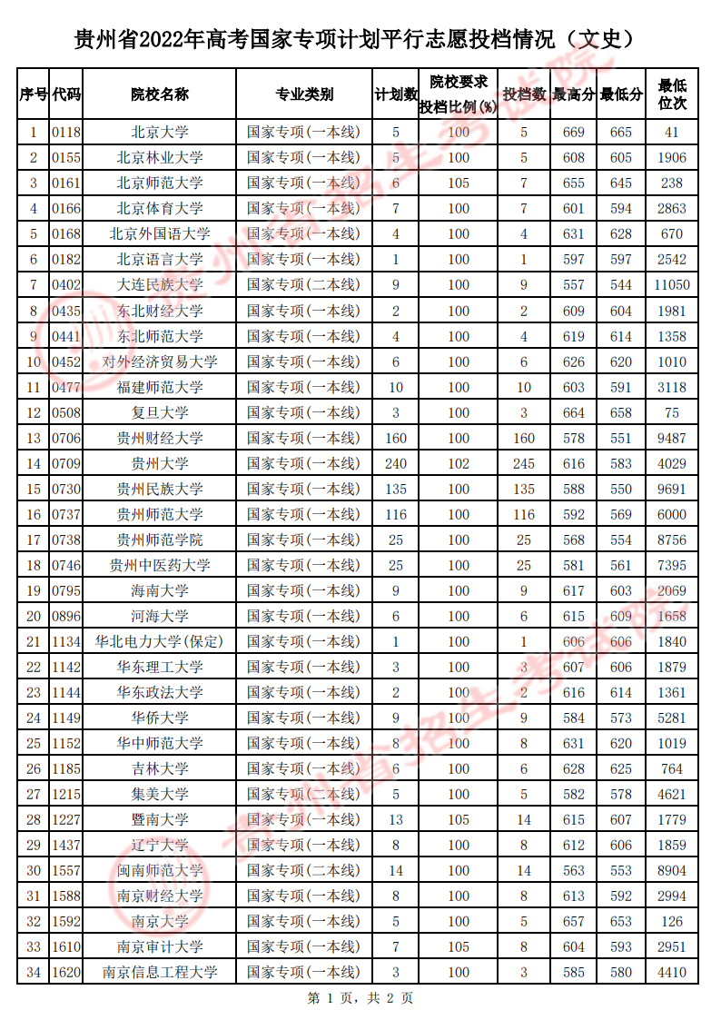 贵州省2022年高考艺术类本科院校平行志愿投档情况