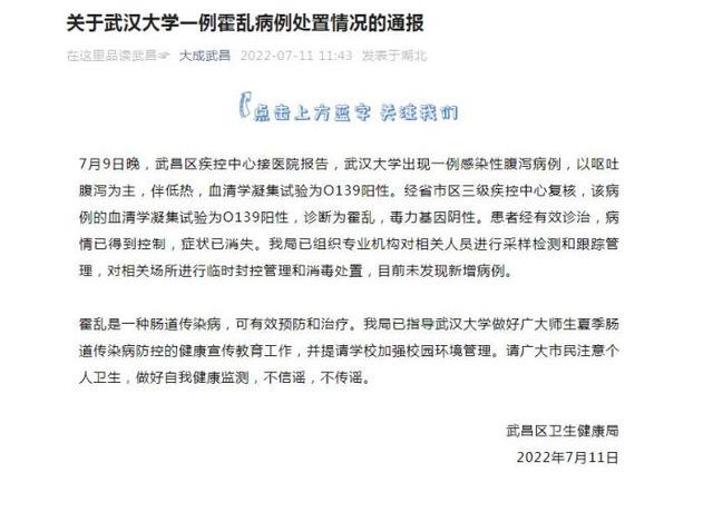 ▲武汉市武昌区卫生健康局通报武汉大学一例霍乱病例处置情况,患者经有效诊治,病情已得到控制,症状已消失,目前未发现新增病例。霍乱是一种肠道传染病,可有效预防和治疗。