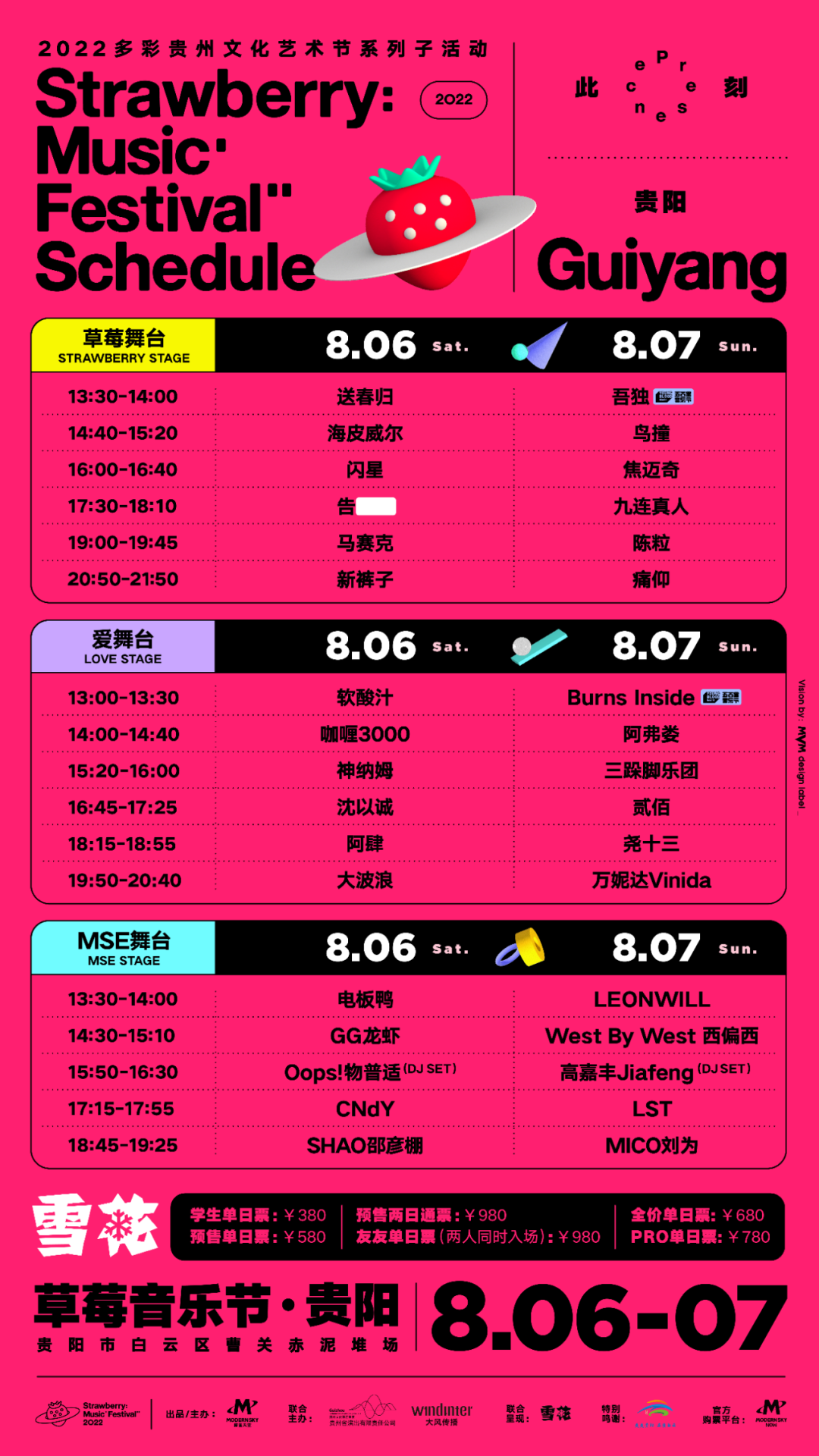 ▲2022多彩贵州文化艺术节系列子活动——2022贵阳草莓音乐节演出阵容11日官宣,票价 ¥ 380 起,音乐节将于8月6日、7日在贵阳市白云区曹关赤泥堆场举行。附近停车场及乐迷接驳大巴正在规划中,详细方案将在之后公布。