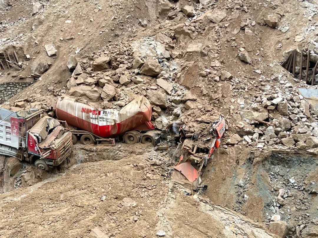 他驾驶的水泥罐车也被一块巨石砸中