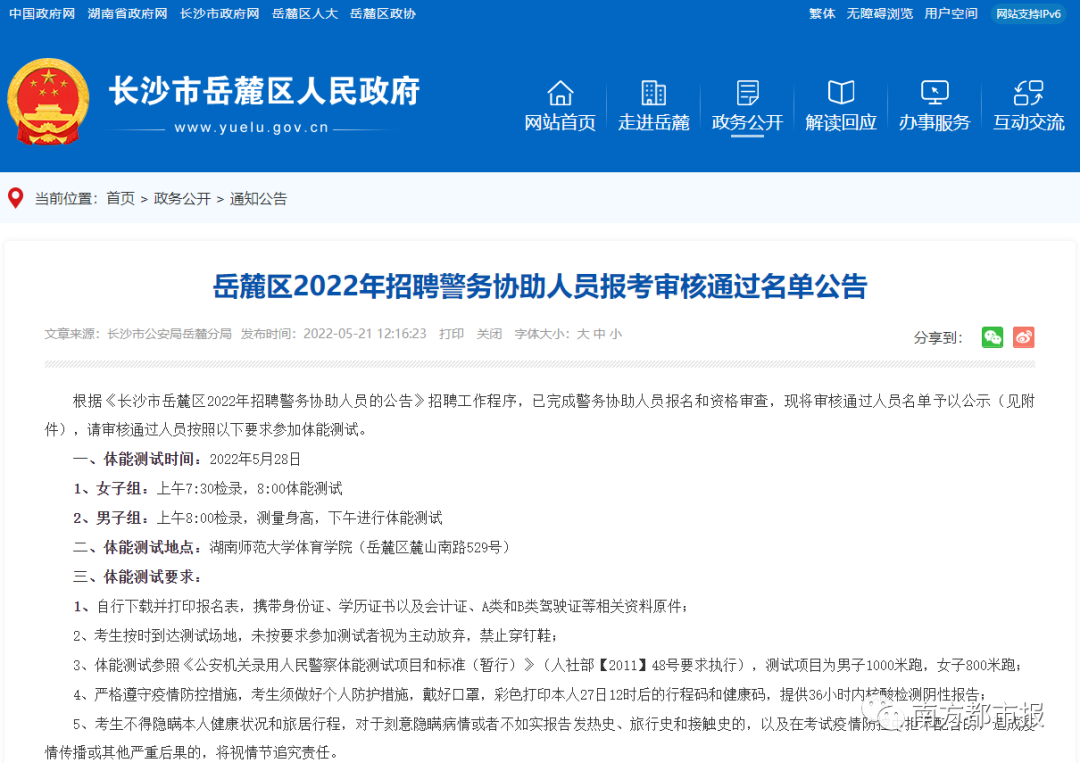 2022年5月,由岳麓区人力资源和社会保障局牵头组织招聘70名警务协助人员,5月12日发布招聘公告。由于疫情防控原因,本次招聘实行网上报名、网上资格初审,5月21日发布网上资格初审通过名单。5月下旬将进行体能测试,体测前要实质审查报名表、学历证书等资料原件,之后进行考试、体检、心理测试和考察等招聘流程。