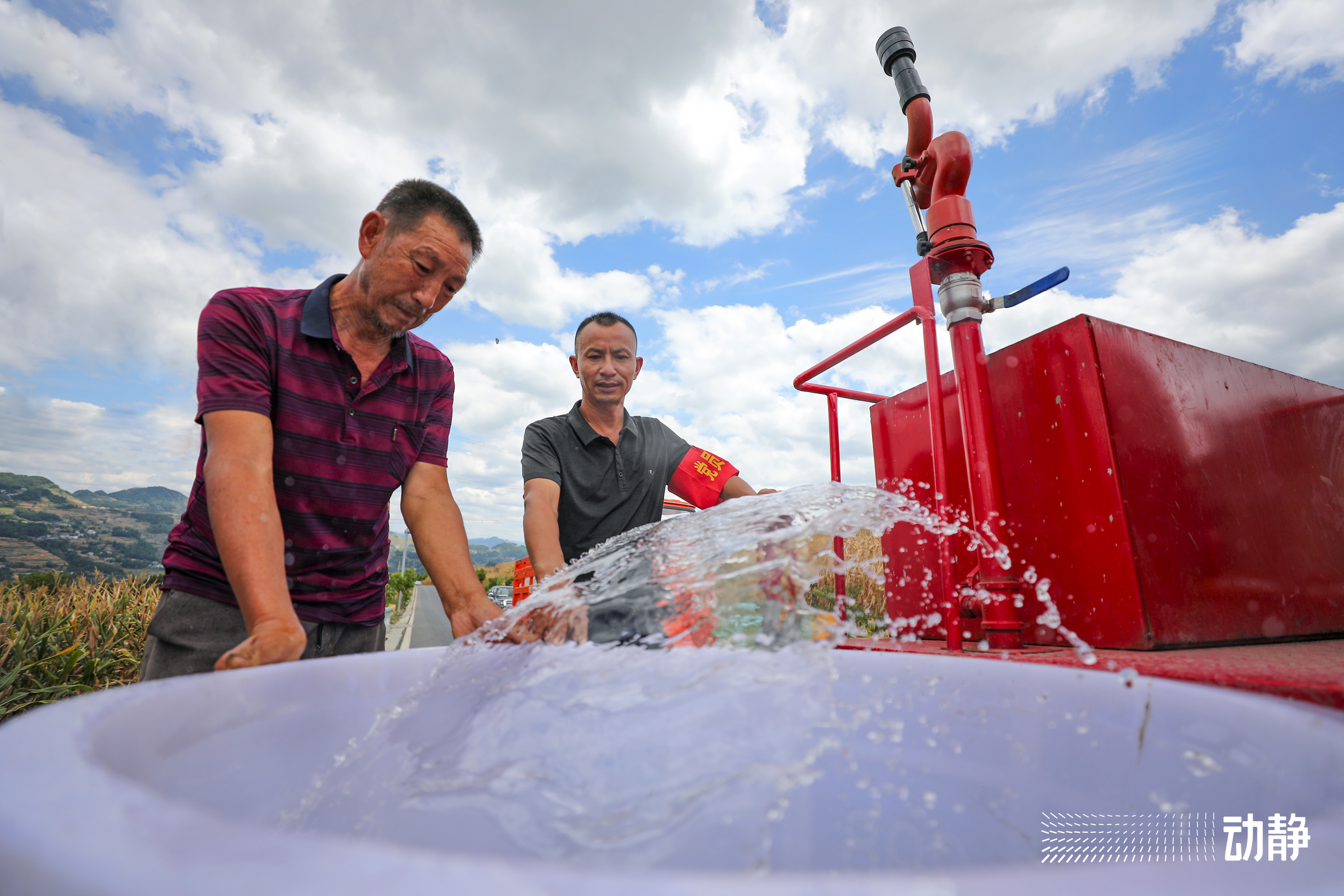 烈日当空,一辆消防运水车、三辆三轮机动车,满载着生活用水沿着蜿蜒而上的公路缓缓驶进黄杨镇群裕社区和洗马池村的各村民组。一个头戴牛仔帽,身着白体恤的小伙子一边驾着三轮车,一边不停地接打电话,脑门儿上的热汗顺着脸颊不停下淌。他叫罗燕,是当地有名的种植大户,也是当地党员送水服务队的志愿者之一。