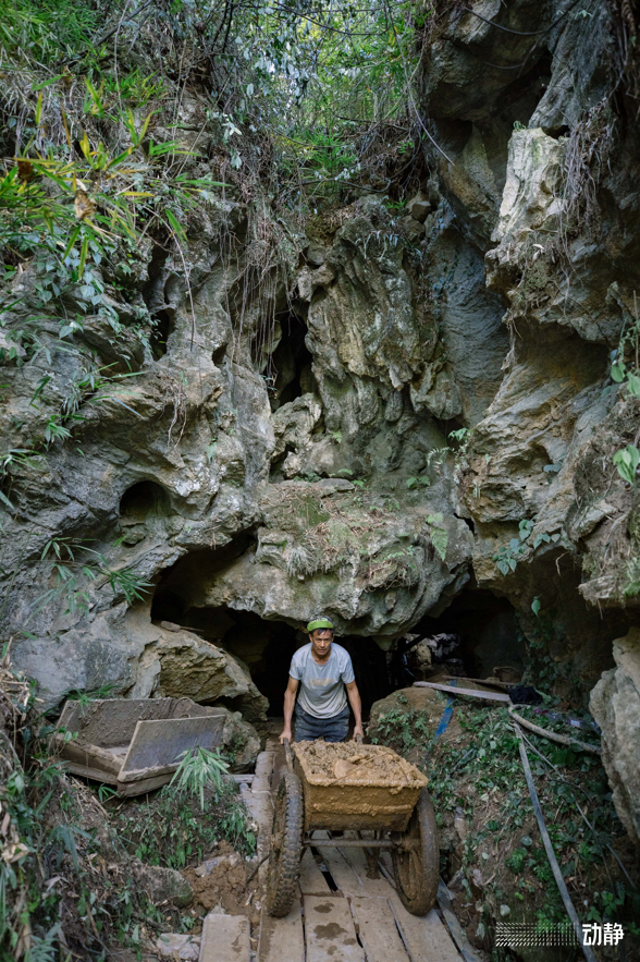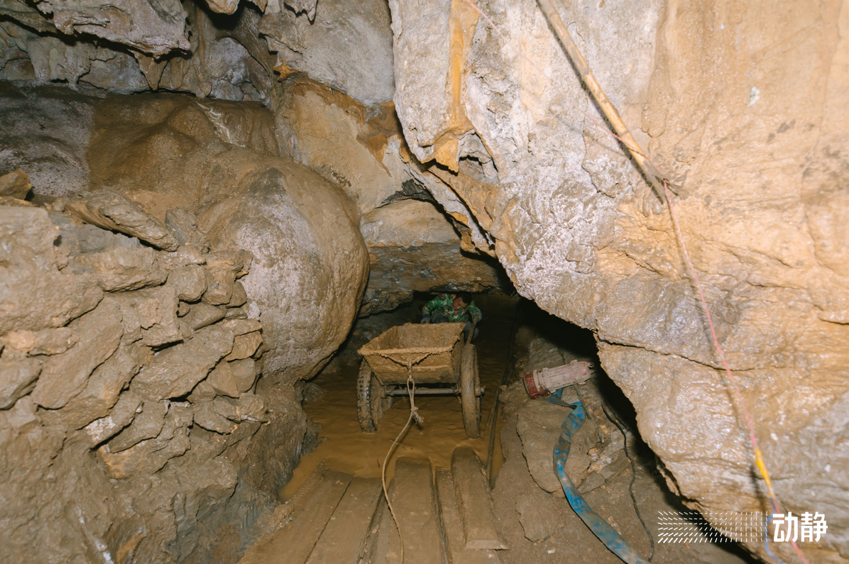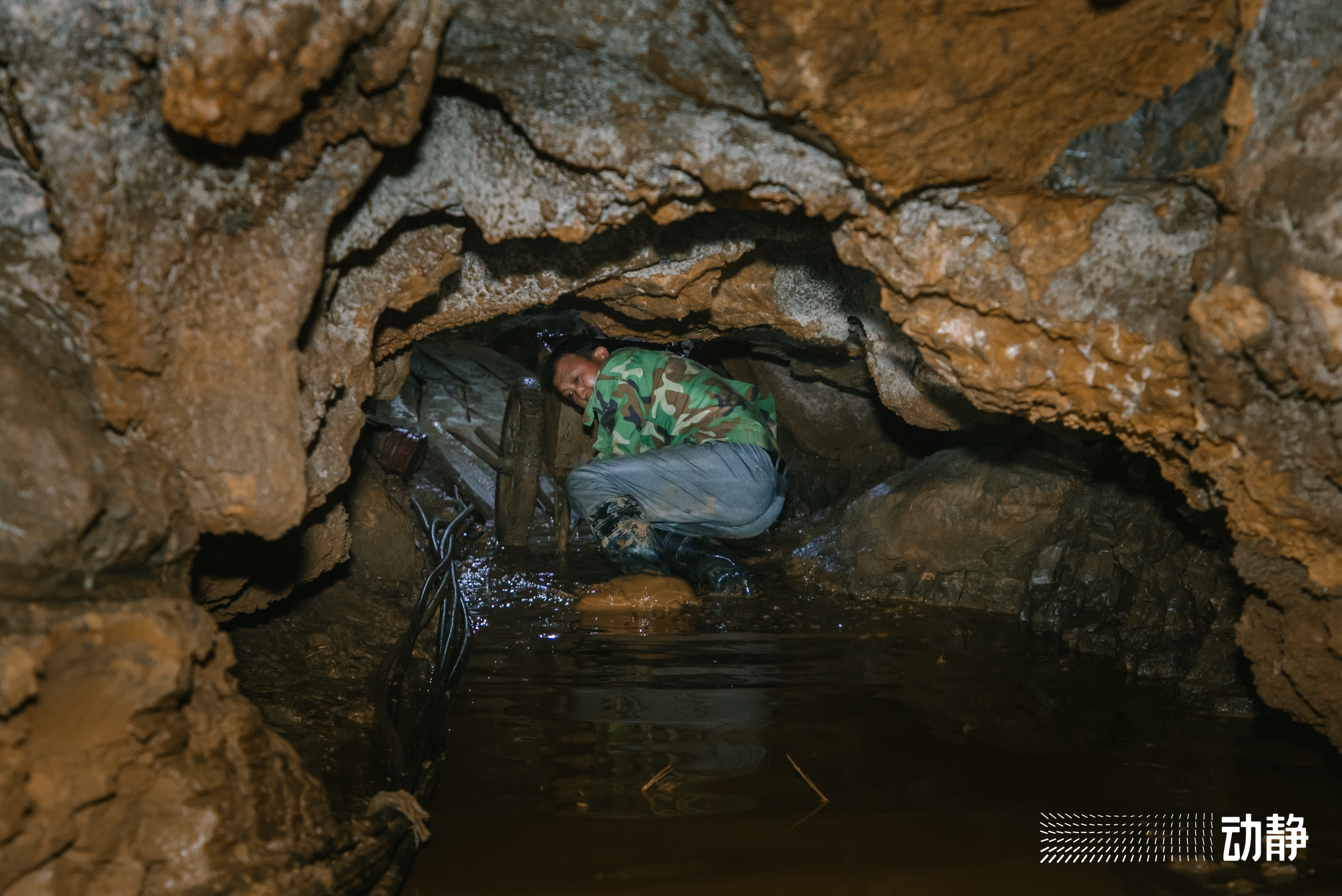 为了趟过数十米暗河,村民艰难地拉着转运泥土的斗车,弯腰曲膝,蜷缩着头,狭窄的空间已经打湿了村民的裤子。