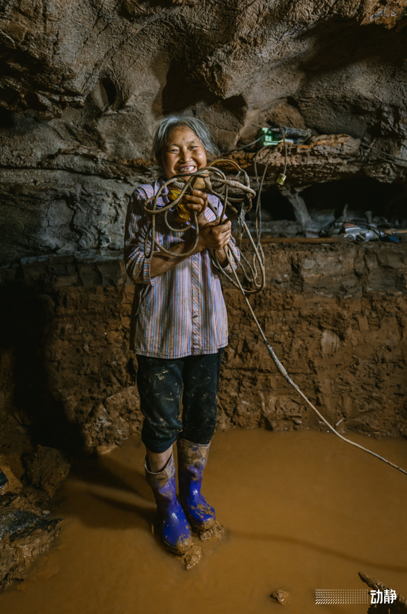年届七旬的老人陈朝仙,站在凸起的石块上,尽管周遭的环境很糟糕,她依旧乐呵呵地举起钻机电线。