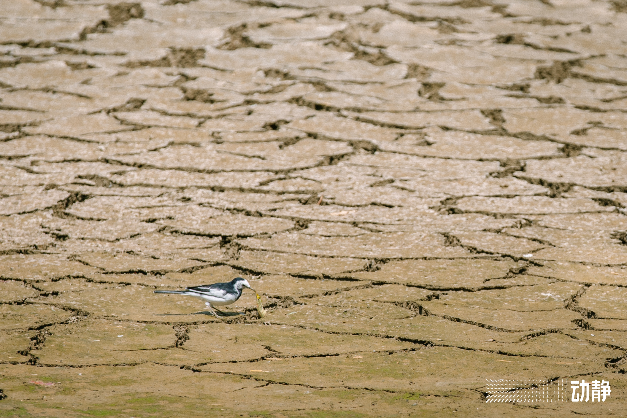 桐梓县小水乡,一只小鸟徘徊在田间干旱的土地上。