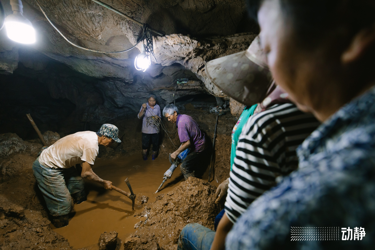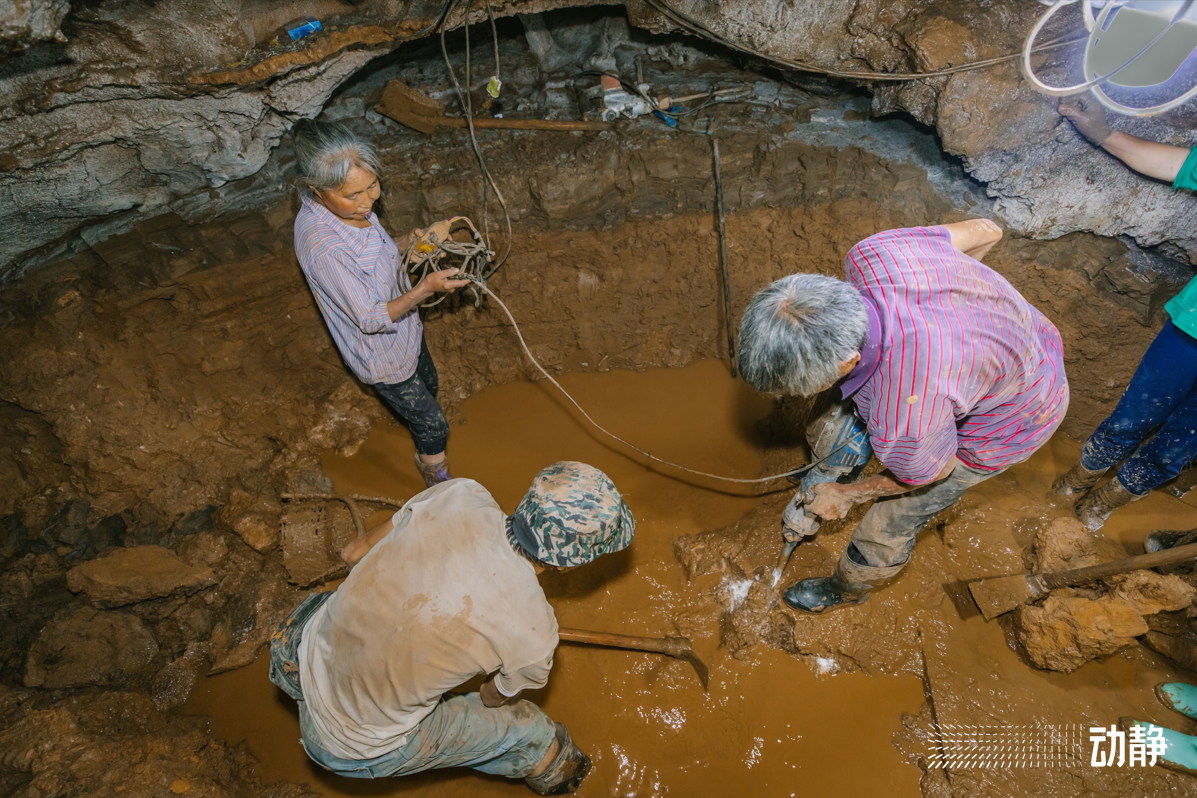 狭窄幽暗的喀斯特洞穴内,村民们正在清理涌水点附近多余的土石方。