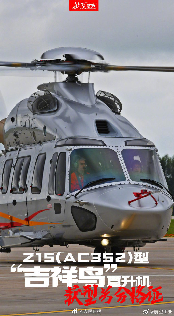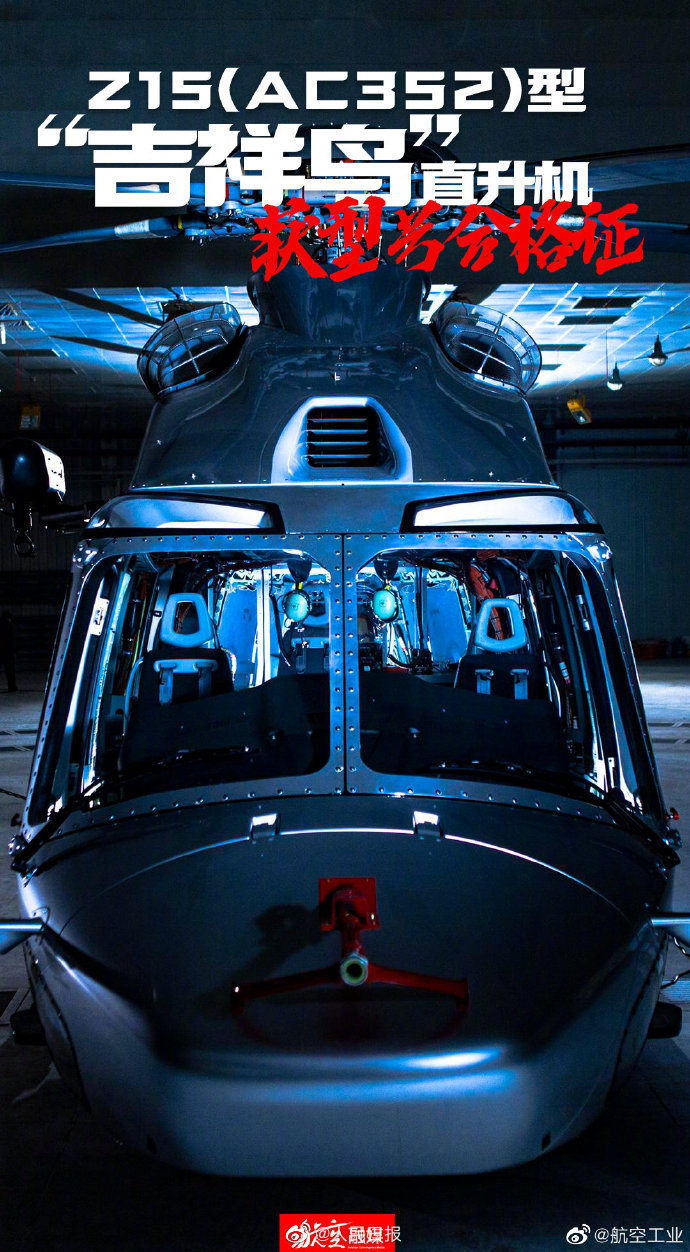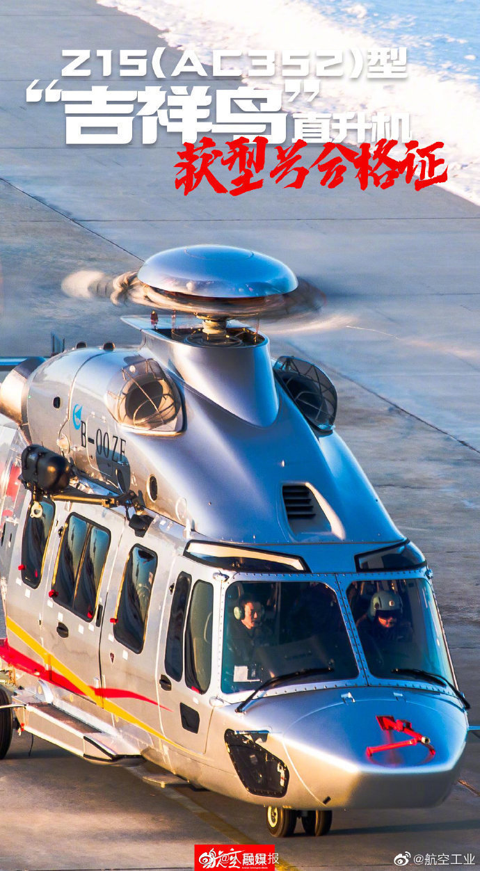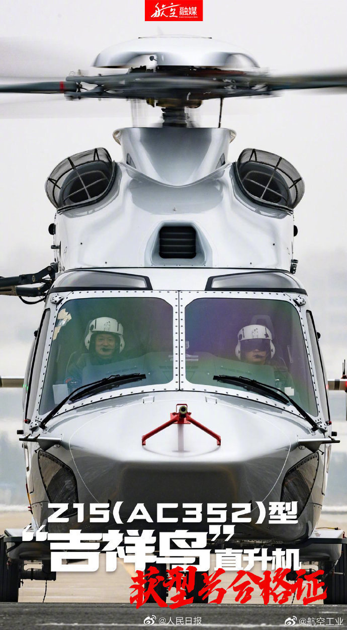 吉祥鸟直升机来了!26日,中国民用航空局向航空工业哈飞颁发了AC352直升机型号合格证,标志着该型直升机研制工作取得圆满成功,具备了进入国内民用市场的条件。AC352直升机是一款国产中型多用途民用直升机,最大起飞重量7.5吨,最大航程850公里,可搭载16名乘客,可广泛应用于搜索救援、人员运输、医疗救护等领域。