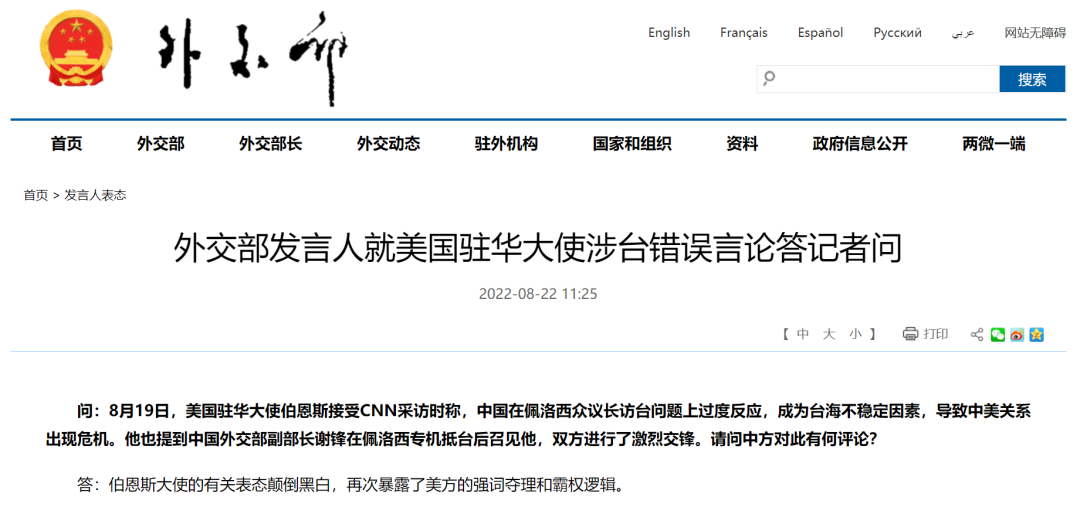 问:8月19日,美国驻华大使伯恩斯接受CNN采访时称,中国在佩洛西众议长访台问题上过度反应,成为台海不稳定因素,导致中美关系出现危机。他也提到中国外交部副部长谢锋在佩洛西专机抵台后召见他,双方进行了激烈交锋。请问中方对此有何评论?