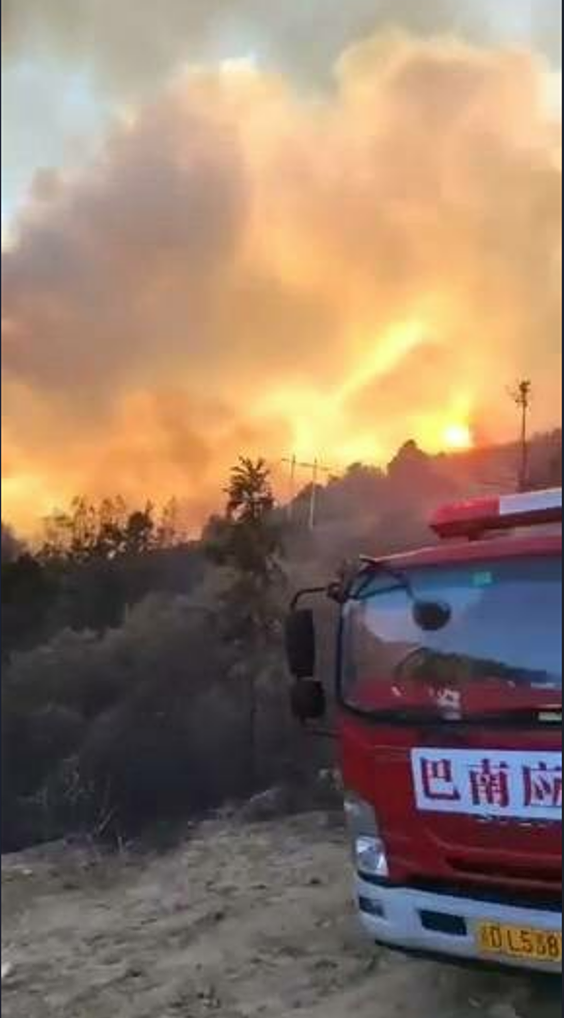 8月21日下午,重庆巴南区界石镇发生山火。据网友拍摄视频显示,现场火光冲天、浓烟滚滚,应急救援车辆已赶到现场,视频中有人说,“遭不住了,遭不住了。已经烧了几匹(座)山了。”