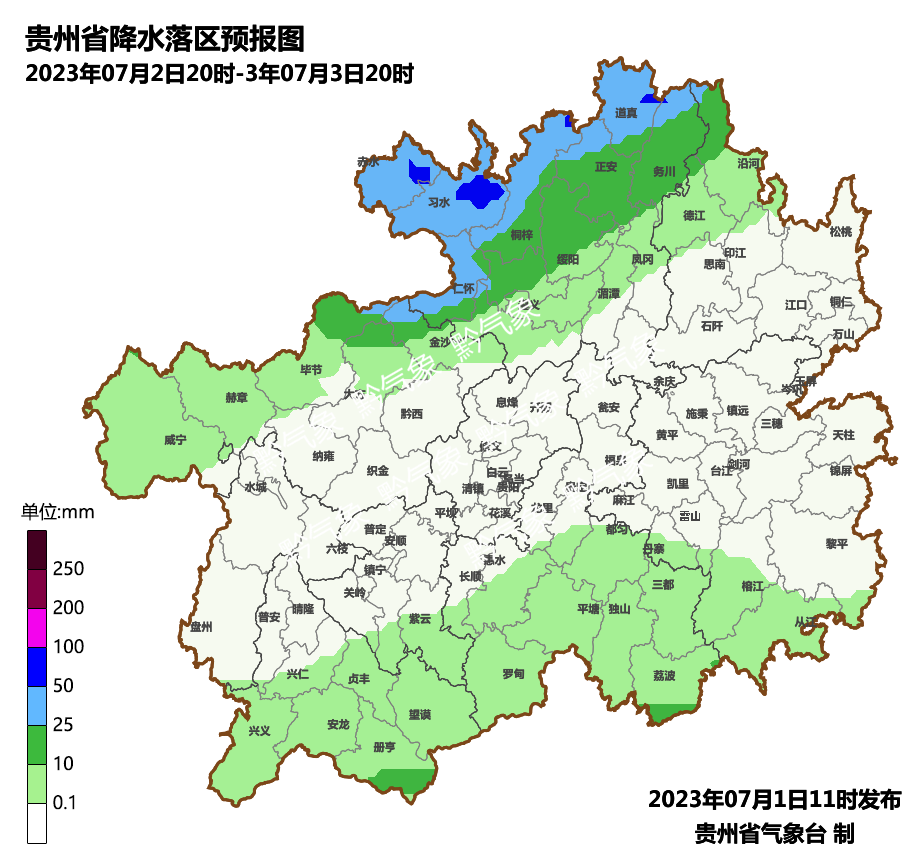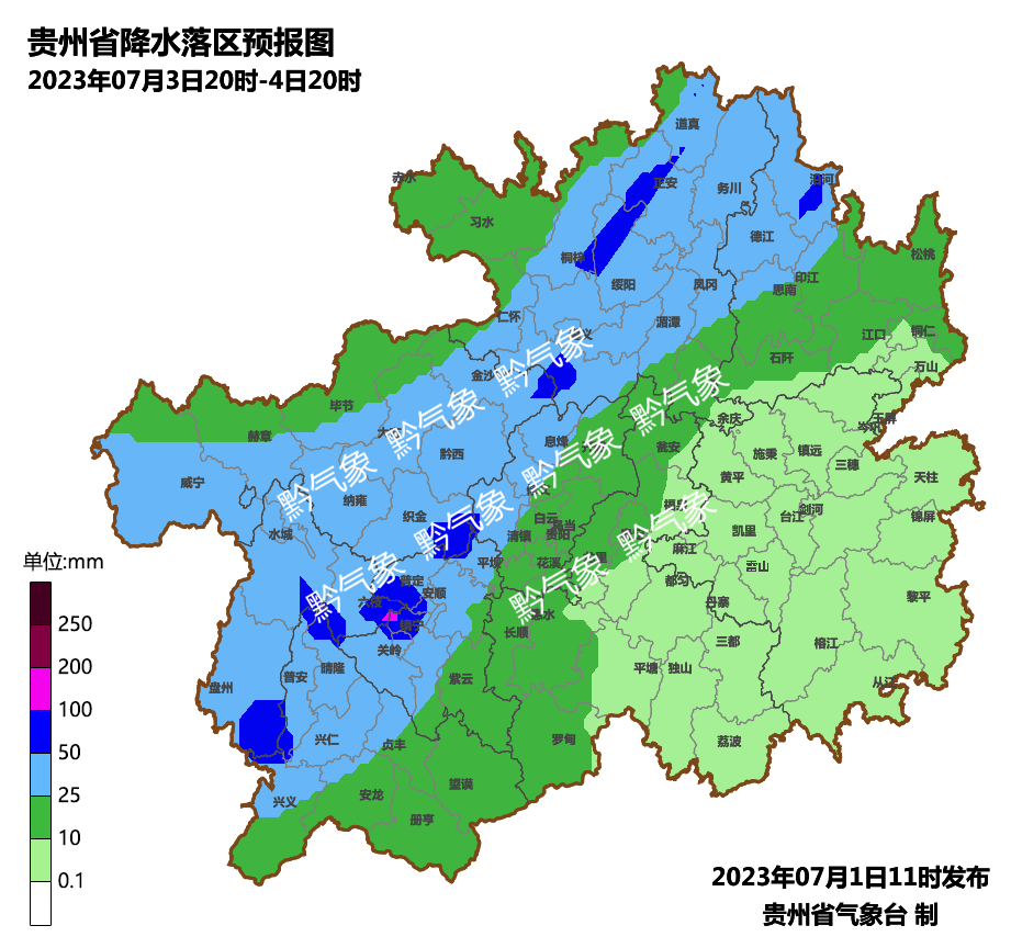 今天夜间到明天白天,毕节市东部、遵义市、铜仁市阴天间多云有阵雨或雷雨,局地有中到大雨,部分乡镇暴雨,个别乡镇大暴雨,其余地区多云有分散阵雨或雷雨;