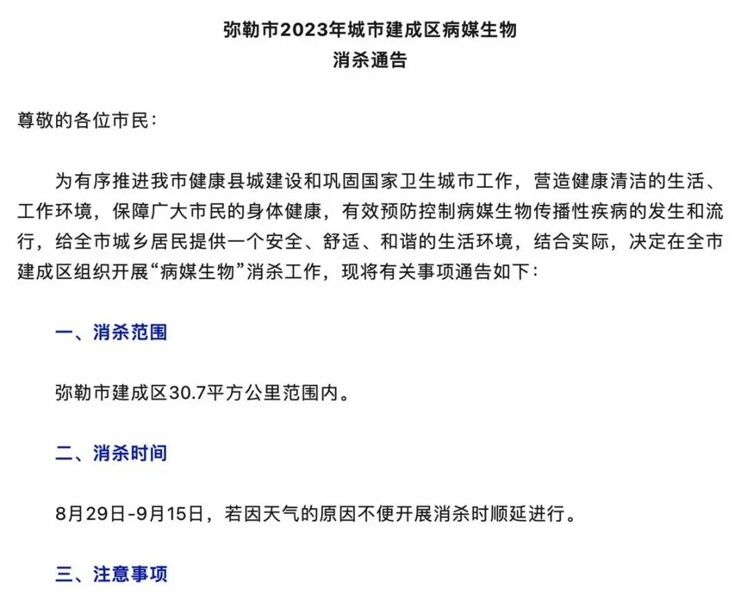 8月28日,云南省弥勒市爱国卫生运动委员会办公室发布《弥勒市2023年城市建成区病媒生物消杀通告》。该通告称,为有序推进健康县城建设和巩固国家卫生城市工作,营造健康清洁的生活、工作环境,保障广大市民的身体健康,有效预防控制病媒生物传播性疾病的发生和流行,结合实际,决定在全市建成区组织开展“病媒生物”消杀工作。其中消杀范围在弥勒市建成区30.7平方公里范围内。消杀时间为8月29日至9月15日,若因天气的原因不便开展消杀时顺延进行。