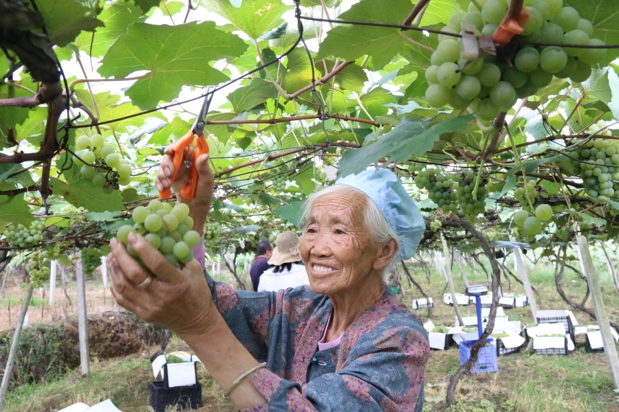 走进影山镇黄桥村葡萄种植基地,一垄垄葡萄架在基地上接连成片,一串串颗粒饱满的葡萄在阳光下晶莹透亮,微风拂过,满园的葡萄清香沁人心脾。葡萄架下,三五个采摘群众躬着身、拿着剪刀,穿梭在葡萄架下,动作利落地摘下一串串精品葡萄,小心翼翼放到框里,随后装箱上车运往村口收购点售卖。