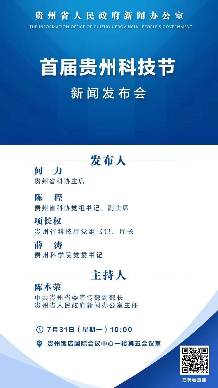 动静记者从省政府新闻办获悉,首届贵州科技节新闻发布会将于7月31日上午十点在贵州饭店举行。届时,省科协联合省科技厅、贵州科学院在会上发布首届贵州科技节召开消息、主体活动安排及亮点、特色,并答记者问。动静新闻客户端将对发布会进行现场直播。