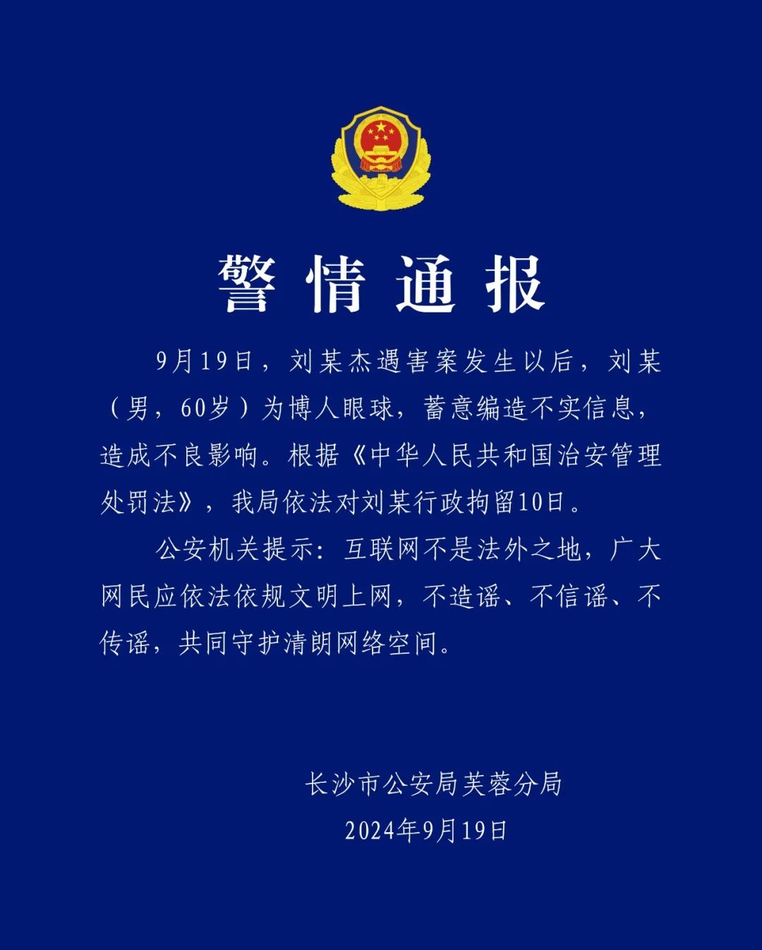 刘某杰遇害案发生以后,刘某(男,60岁)为博人眼球,蓄意编造不实信息,造成不良影响。根据《中华人民共和国治安管理处罚法》,长沙市公安局芙蓉分局依法对刘某行政拘留10日。
