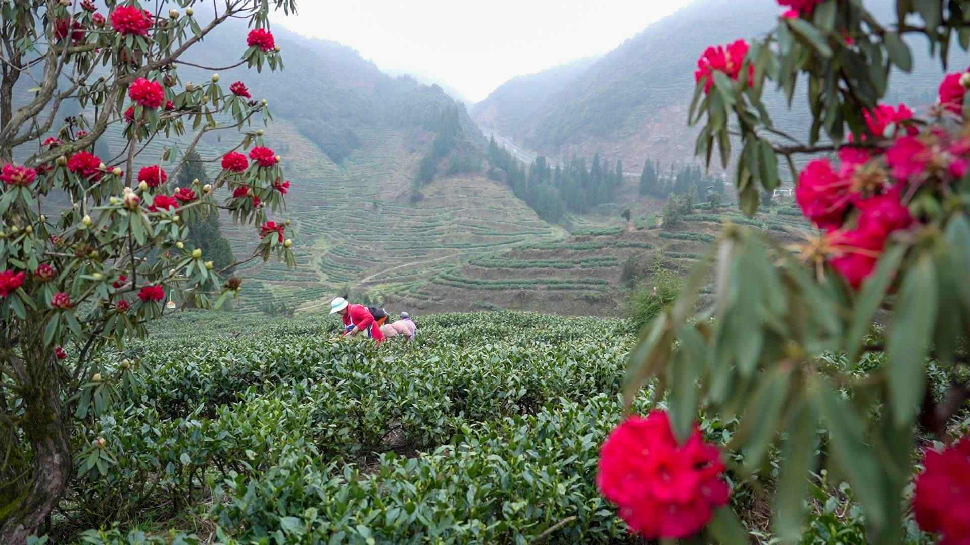 走进民主镇2400亩的沁心茶场,争奇斗艳的杜鹃花与整齐划一的茶树交相辉映,阵阵茶香沁人心脾,采茶工人来回穿梭在茶园里,一幅生机勃勃的春日美景。