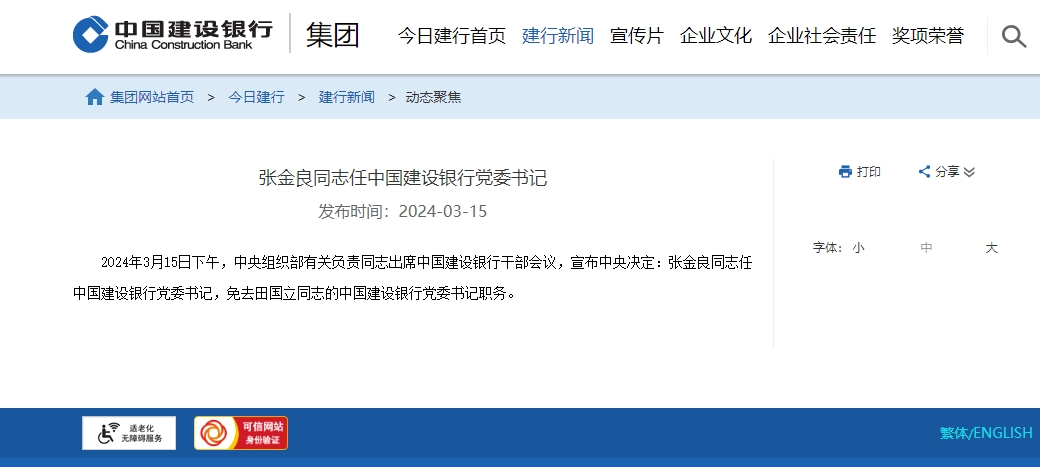 2024年3月15日下午,中央组织部有关负责同志出席中国建设银行干部会议,宣布中央决定:张金良同志任中国建设银行党委书记,免去田国立同志的中国建设银行党委书记职务。