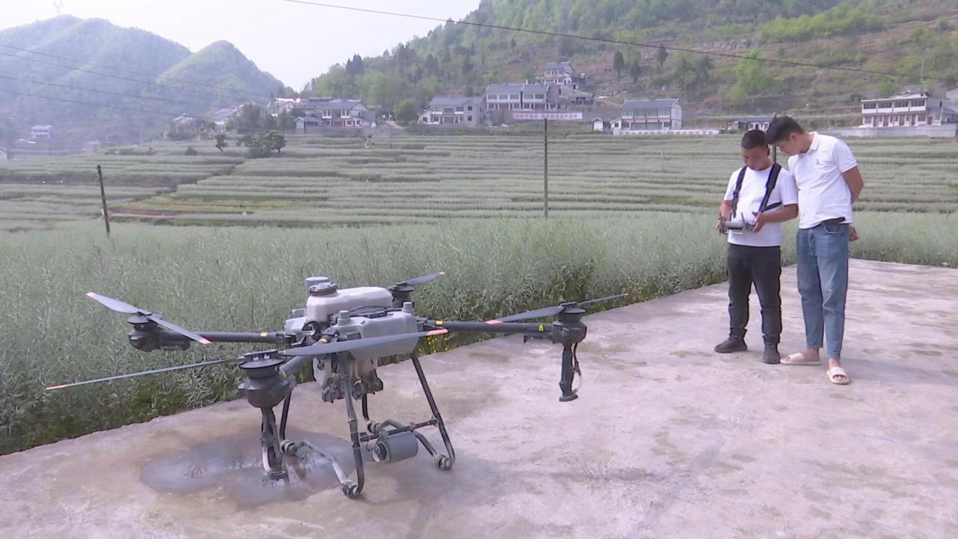 在播州区鸭溪镇金钟村油菜水稻轮作种植基地,阵阵旋翼轰鸣声传来,2台满载药液的植保无人机在技术员的操控下,在长满油菜荚的田地里来回穿梭,喷洒药物。几分钟的时间,一块油菜地的病虫害防治就完成了。