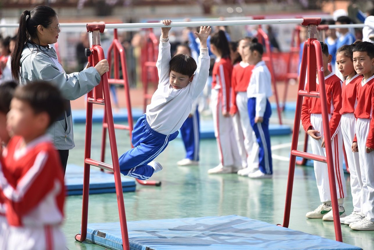 3月31日上午,江苏徐州柳新实验小学的操场上,当近3000名小学生和幼儿园的幼儿分别展示他们掌握的单杠运动技能时,现场观摩的来自徐州全市的百余位体育教研员、体育教师、校长们不禁发出阵阵惊叹声。单杠作为学生参与体育活动的主要器械之一,曾广泛分布于我国各级学校。但出于安全考虑,近30年来,单杠在国内小学已逐渐销声匿迹,能在单杠上轻松翻飞的小学生自然也难得一见。因此,当徐州市柳新实验小学的小学生和徐州市柳新镇9所幼儿园的幼儿们熟练地在单杠上悬垂、摆动、翻身时,观摩人员情不自禁地感慨起来。