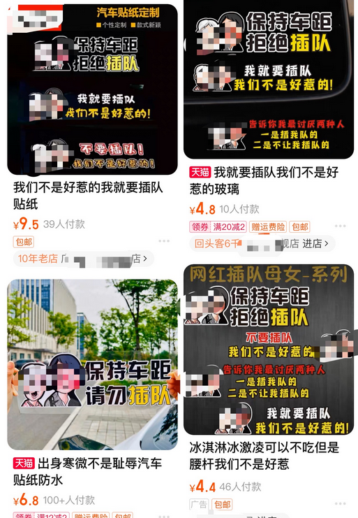 在“淘宝”平台上搜索“插队”“车贴”等关键词,有超过30家店铺在销售以两女子的漫画图为主题的汽车贴纸,贴纸上还配文:“不要插队,我们不是好惹的。”“告诉你我最讨厌两种人,一是插我队的,二是不让我插队的。”