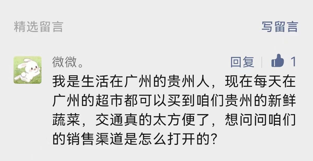 网友提问:我是生活在广州的贵州人,现在每天在广州的超市都可以买到咱们贵州的新鲜蔬菜,交通真的太方便了,想问问咱们的销售渠道是怎么打开的?