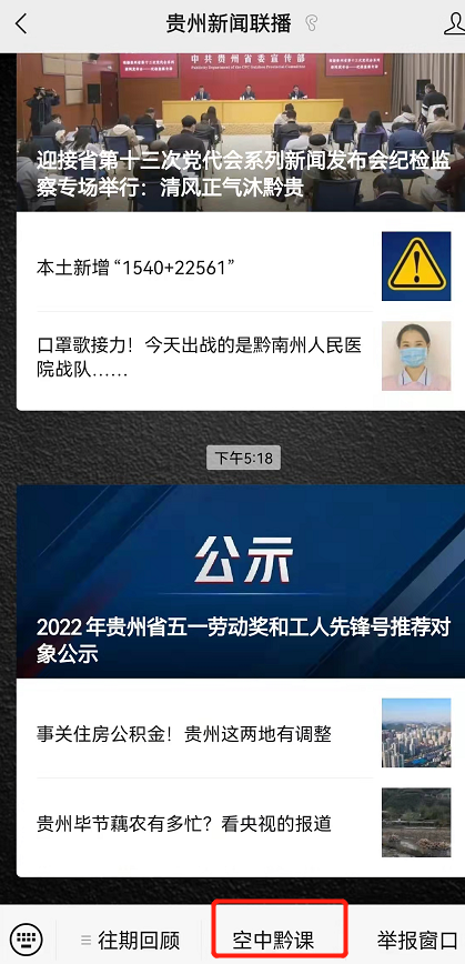 在贵州新闻联播微信号上服务栏点击“空中黔课”收看。