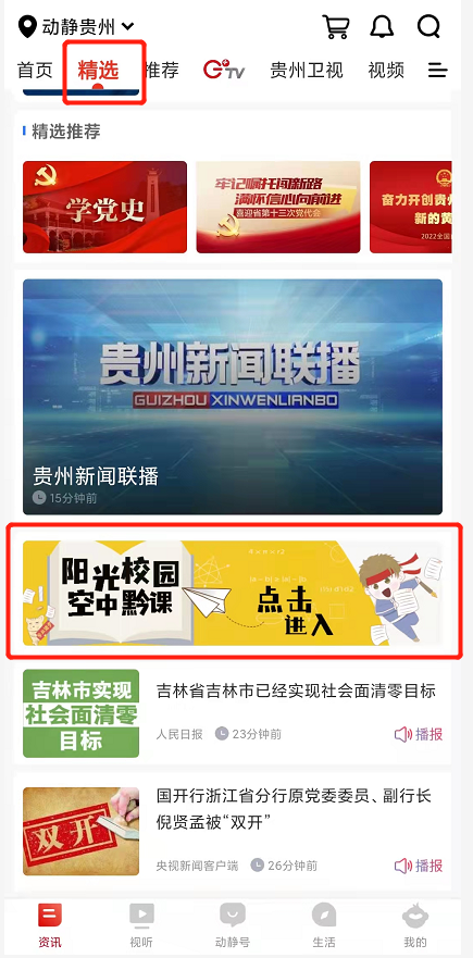 下载贵州广播电视台官方新闻客户端“动静APP”,进入后,在精选页“阳光校园·空中黔课”专区就可以收看。