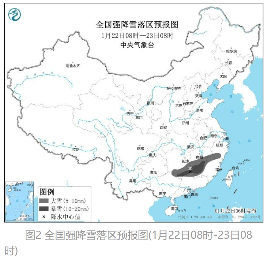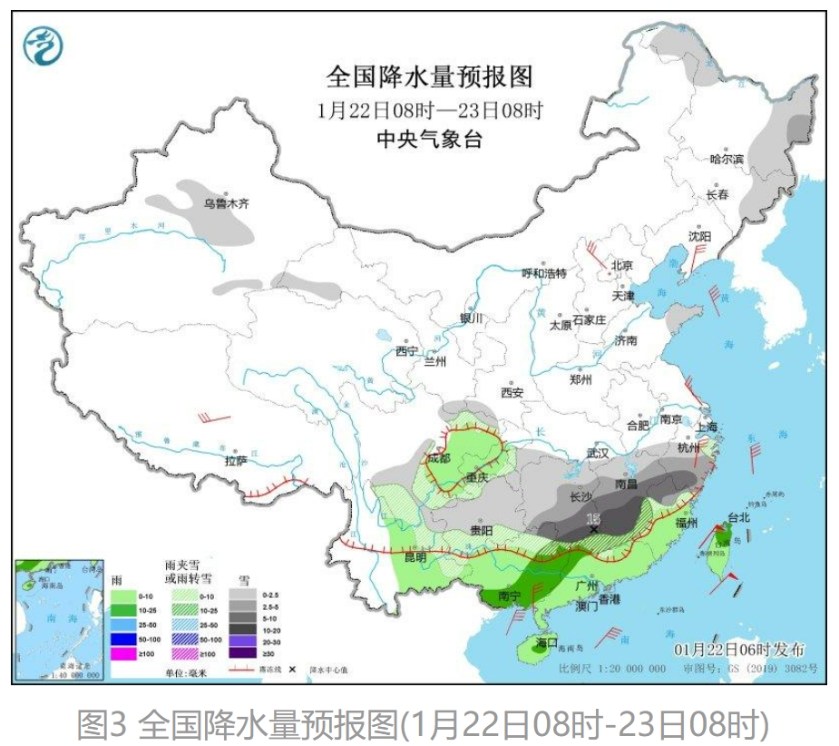 1月22日08时至23日08时,黑龙江东部和西北部、吉林东部、新疆中部、甘肃河西、川西高原西南部、四川盆地南部、陕西南部、重庆东部、云南东部、贵州、湖北西部、湖南南部、江西、安徽南部、浙江中南部、福建北部、广东北部、广西北部等地部分地区有小到中雪或雨夹雪,其中,湖南南部、江西中南部、浙江西南部、福建西北部、广西东北部、广东北部等地部分地区有大到暴雪(10~15毫米)。四川盆地中部、云南中部、广西中南部、广东中南部、福建中南部、海南岛、台湾岛等地部分地区有小到中雨。辽东半岛、河北北部、浙江北部、广西东南部沿海等地部分地区有5~6级风,渤海、渤海海峡、黄海、东海、台湾海峡、台湾以东洋面、巴士海峡、南海大部、北部湾等海域有6~8级风,阵风9~10级(见图3)。