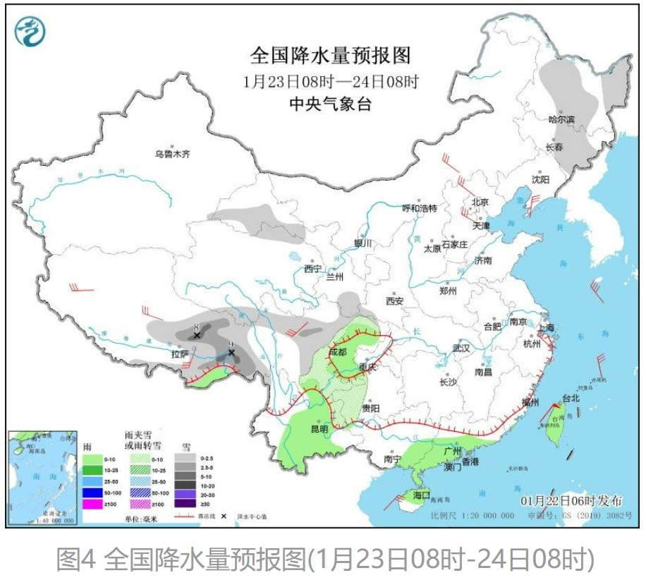 1月23日08时至24日08时,黑龙江中东部、吉林中东部、西藏南部和东部、青海北部和南部、甘肃河西和南部、川西高原中东部、四川盆地西部、贵州西部、云南东北部等地部分地区有小雪或雨夹雪,其中,西藏东部局地有中到大雪(5~9毫米)。西藏东南部、四川盆地西部、云南中东部、广西东部、广东中南部、海南岛中北部、台湾岛等地部分地区有小雨。内蒙古中部、辽东半岛、河北中北部、浙江北部、川西高原北部等地部分地区有5~6级风,渤海、渤海海峡、黄海、东海、台湾海峡、台湾以东洋面、巴士海峡、南海大部、北部湾等海域有6~7级风,阵风8~9级(见图4)。