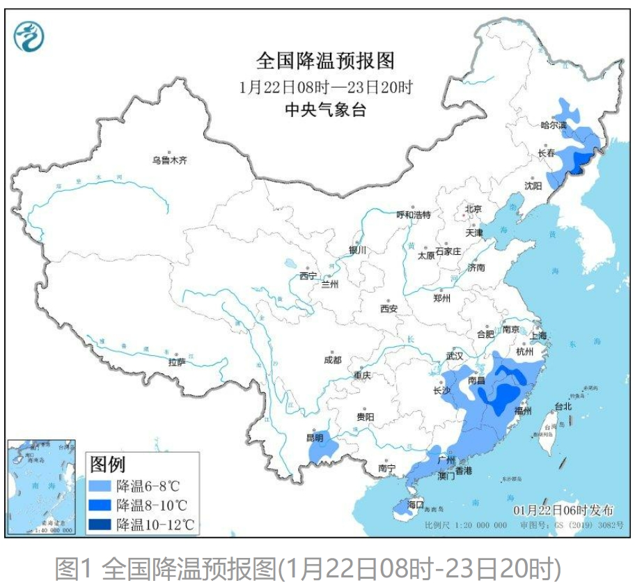 受强冷空气影响,预计,1月22日08时至1月23日20时,东北地区东部、江南中南部、华南中东部、云南东部等地将降温6~8℃,其中,吉林东部局地降温可达10~12℃。1月23日最低气温0℃线将南压到广西北部和广东北部一带。23日和24日,江南、华南北部、贵州等地的最低气温可达-8~-1℃,华南中南部可达0~8℃。我国东部沿海和江西、湖南等地的部分地区将有5~6级、阵风7~8级大风,东部和南部海域将有6~8级大风,阵风9~10级。中央气象台1月22日06时发布寒潮蓝色和大风蓝色预警。