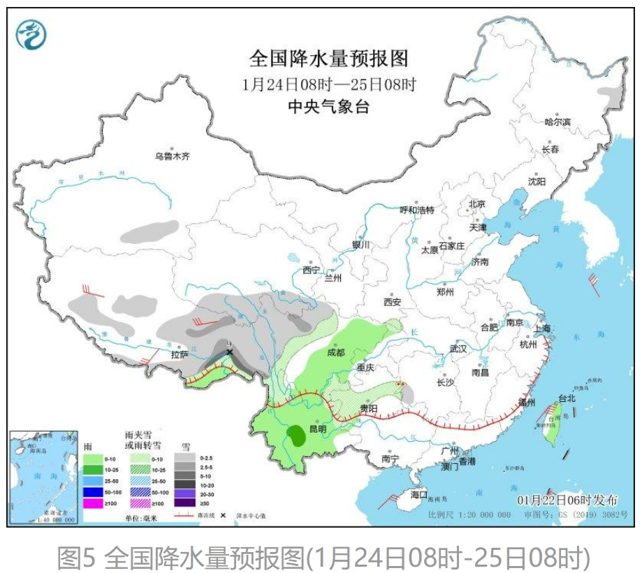 1月24日08时至25日08时,黑龙江东北部、新疆南疆盆地、西藏北部和东部、青海南部、川西高原、云南西北部、贵州西部和中部、湖南西部等地部分地区有小雪或雨夹雪,其中,西藏东南部、川西高原北部等地局地有中到大雪(5~9毫米),湖南西部、贵州中部、云南东部等地局地有冻雨。西藏南部、四川盆地中东部、云南大部、台湾岛等地部分地区有小雨,局地中雨。黄海、东海、台湾海峡、台湾以东洋面、巴士海峡、南海大部、北部湾等海域有6~7级风,阵风8~9级(见图5)。