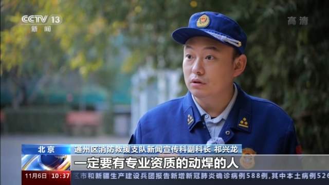 北京市通州区消防救援支队新闻宣传科副科长 祁兴龙:一定要跟装修公司沟通好,一定要有专业资质的动焊的人来为咱们家进行焊接,并且也要在附近,你要做好看火人的职责。把水盆、灭火器、沙土准备好,除去周边的可燃物。他动完焊以后,咱们要好好检查一遍,确保不会发生火灾,确保这些焊渣的温度都降下来了再离开现场。