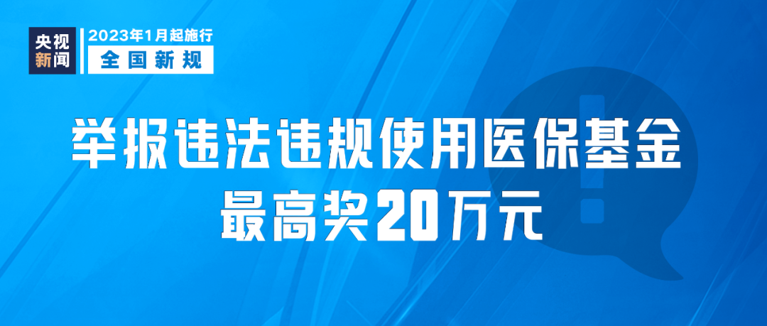 《违法违规使用医疗保障基金举报奖励办法》2023年1月1日起施行,明确把针对所有违法违规使用医保基金行为的举报纳入奖励范围。同时将奖励金额上限由10万元提升至20万元,并设置了最低200元的奖励金额下限。