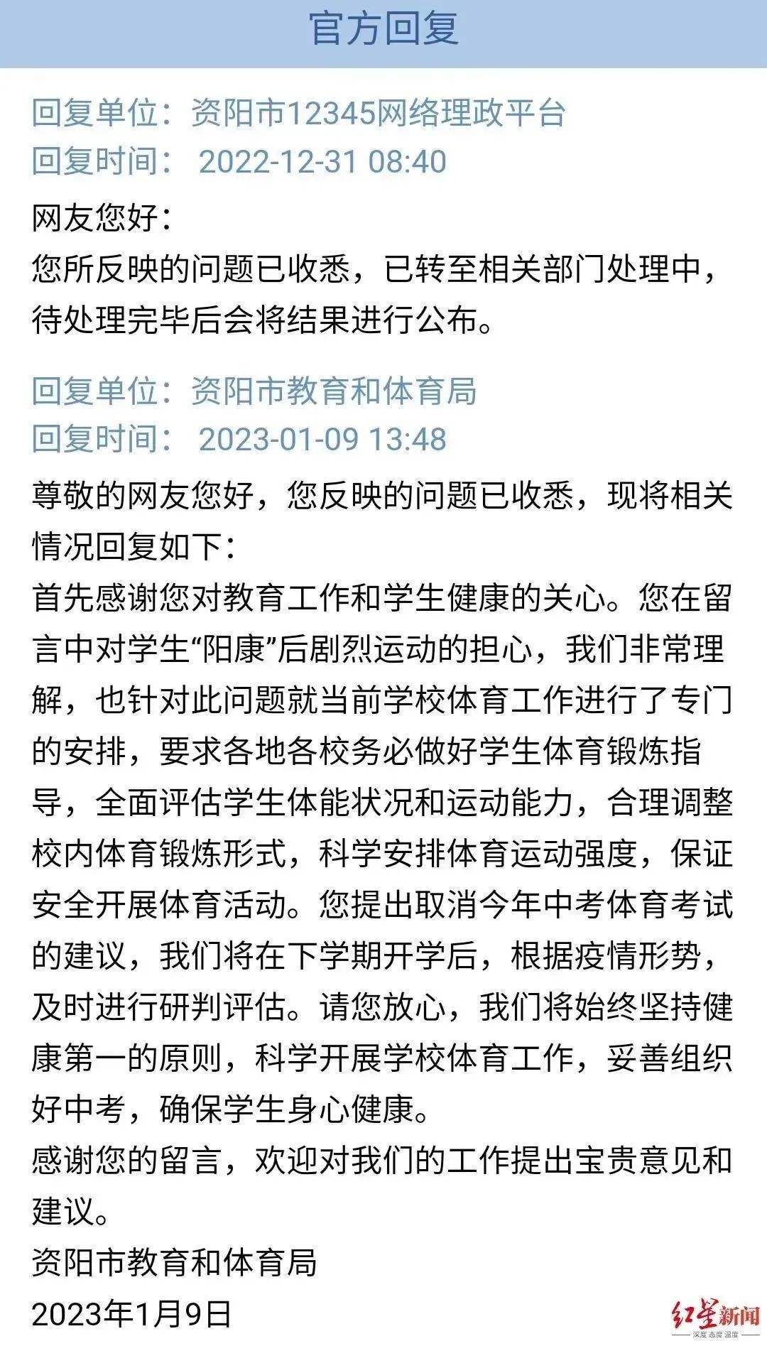 1月9日,资阳市教育和体育局公开回应了网友的建议。其中称,教体部门要求各地各校务必做好学生体育锻炼指导,全面评估学生体能状况和运动能力,合理调整校内体育锻炼形式,科学安排体育运动强度,保证安全开展体育活动。