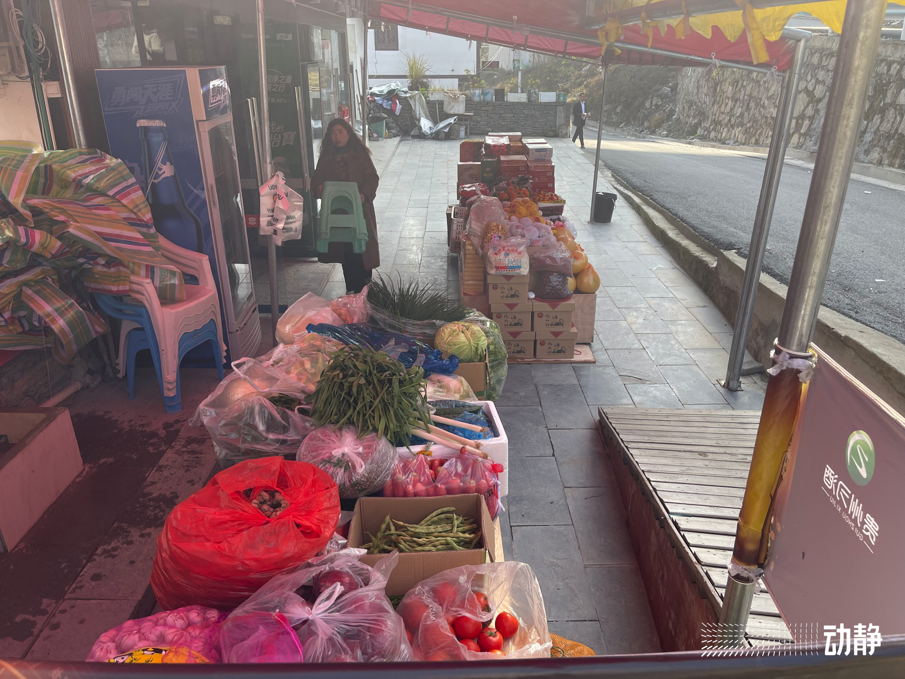 冬日的太阳暖暖地照进村里,沿路的几家小超市,把货物摆在了门口,年货红红火火的,好不热闹。摆放出来的橘子、苹果、柚子等水果,成色新鲜,阳光把水果衬得又红又亮,惹人喜爱。