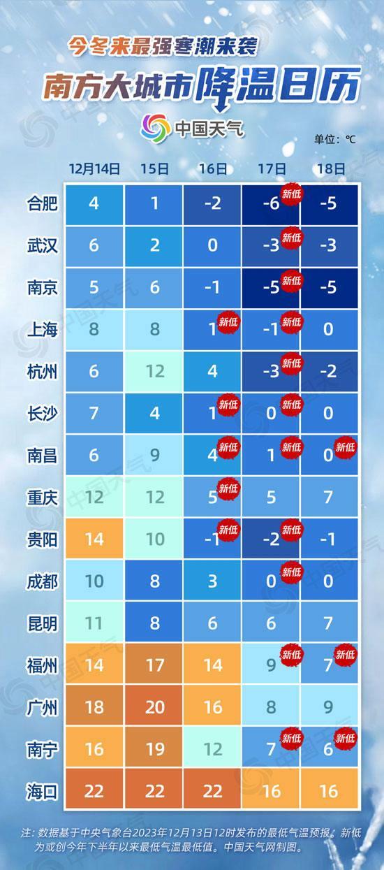 从南方大城市降温日历来看,未来五天,合肥、武汉、南京、上海、杭州、贵阳最低气温都将逐步下降到冰点以下。南昌16日至18日最低气温或连创新低,贵阳最低气温将从14℃降至-2℃,降幅可达16℃。