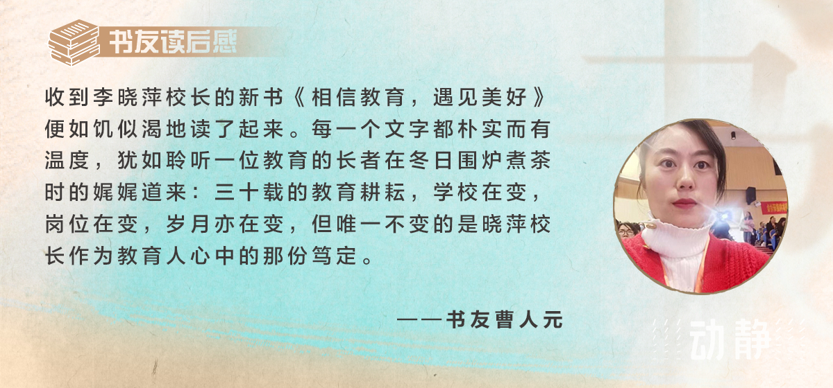 如果说“一个人的阅读史就是一个人的精神发展史”,那么,一个校长的阅读史就是她的教育蓝图。晓萍校长读书涉猎广泛,从柏拉图的《理想国》、马克斯·范梅南的《教育的情调》、帕尔默的《教学勇气》,到苏霍姆林斯基、霍懋征、石中英,每一本书都在丰富她的教育主张,她在读书随笔《对话,让教学更有勇气》一文中说:“人天生有惰性,离开舒服区、从头开始更新理念、接受学习,是不容易的。面对新事物的挑战,勇于尝试的总是年轻的新生代,学校的骨干教师是最不容易走出过去的成就的。但越是这样,我们越要鼓足勇气,改变自己。对自己定位准确后,就要考量学校的需求。将个人的成长与发展融入学校的发展中,在改变中追寻教育理想。”成长中的李晓萍成就了成长中的两所优质学校。